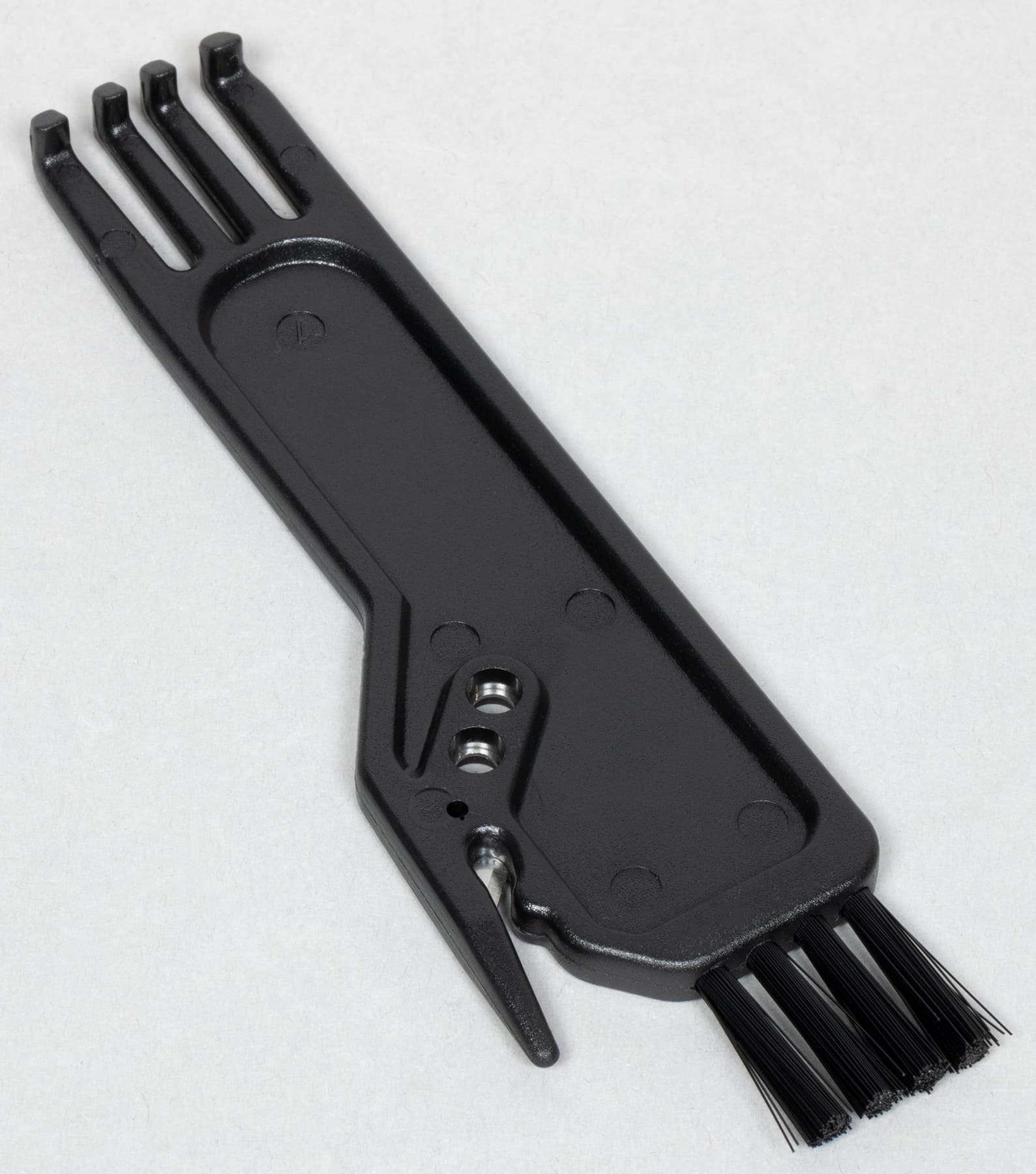 В комплект пылесоса входит также несложный инструмент для очистки, состоящий из щеточки, гребенки и лезвия, с помощью которого удобно освобождать роторы от намотавшихся на них волос и ниток.
