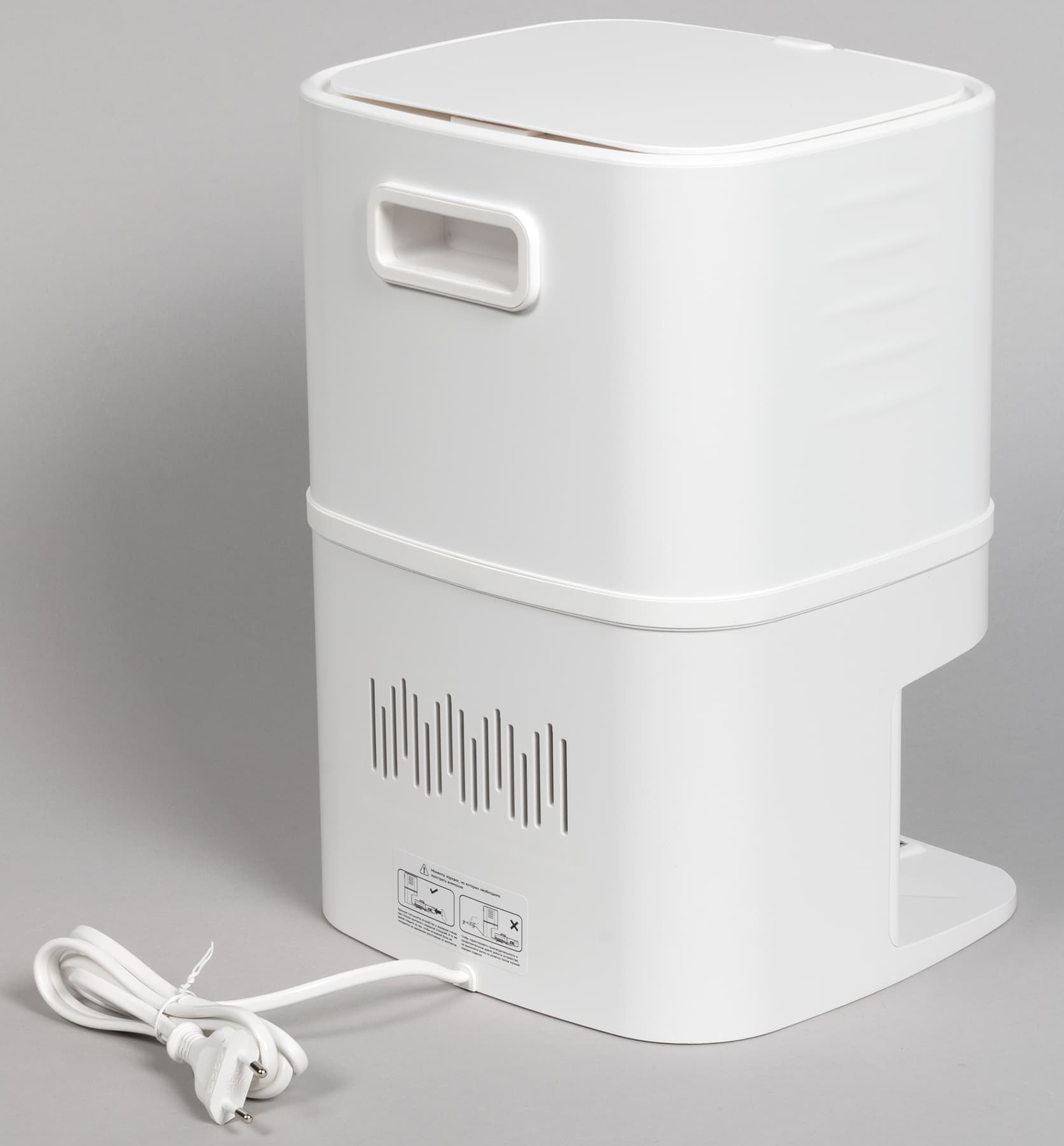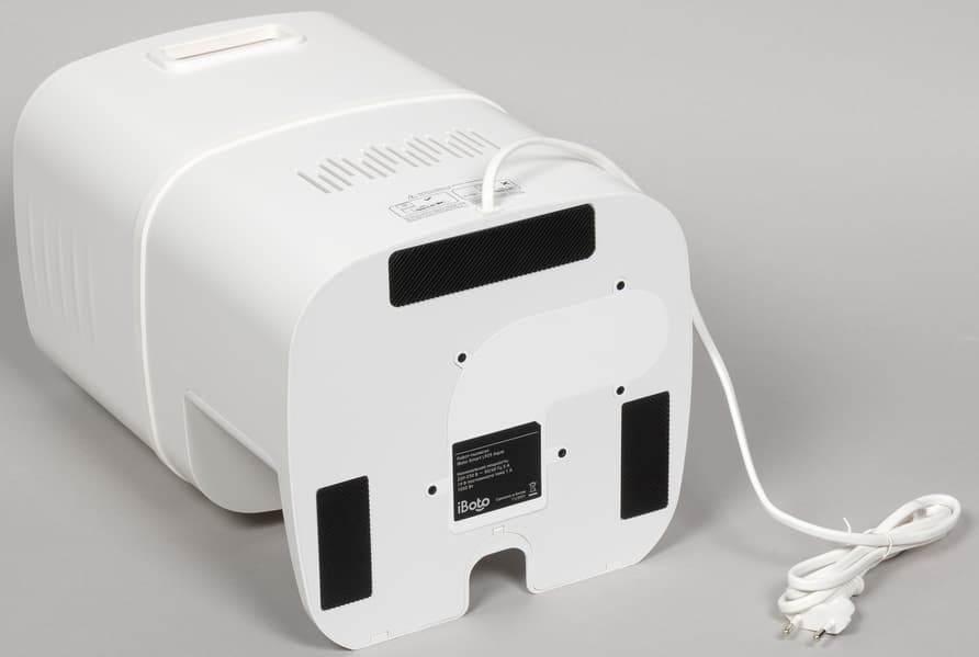 Выпускная решетка размещена на задней стороне базы. Над ней есть еще одна ниша — на этот раз служащая ручкой для переноски. Устройство питается непосредственно от сети: из нижней части «тыла» выходит только электропровод с евровилкой.