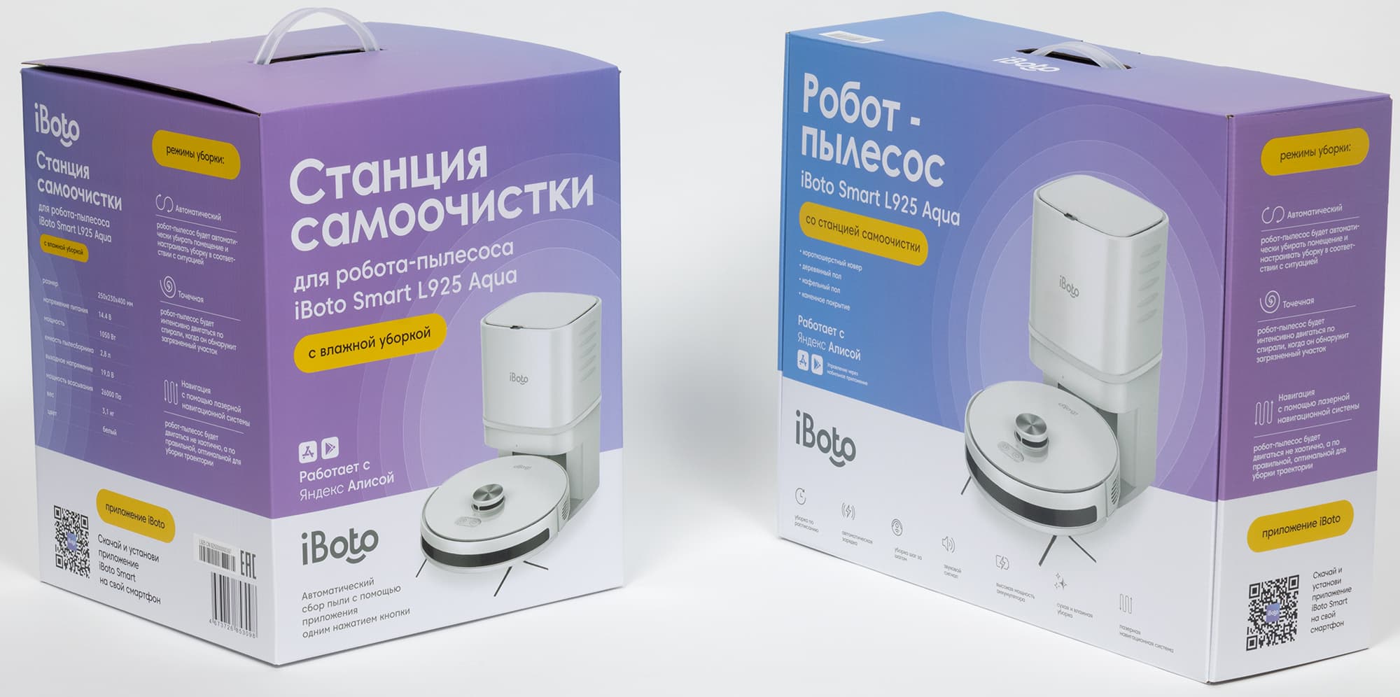 Покупатель получит сразу две ярких коробки: одну с самим роботом-пылесосом и комплектом расходников и аксессуаров, во второй — база с контейнером самоочистки. При изучении передней стенки первой упаковки можно составить представление об устройстве по фотографии и узнать обо всех напольных покрытиях, на которые оно рассчитано: короткошерстный ковер, деревянный и кафельный полы, а также каменное покрытие. Кроме того, производитель сообщил там о совместимости с голосовым помощником Яндекса.