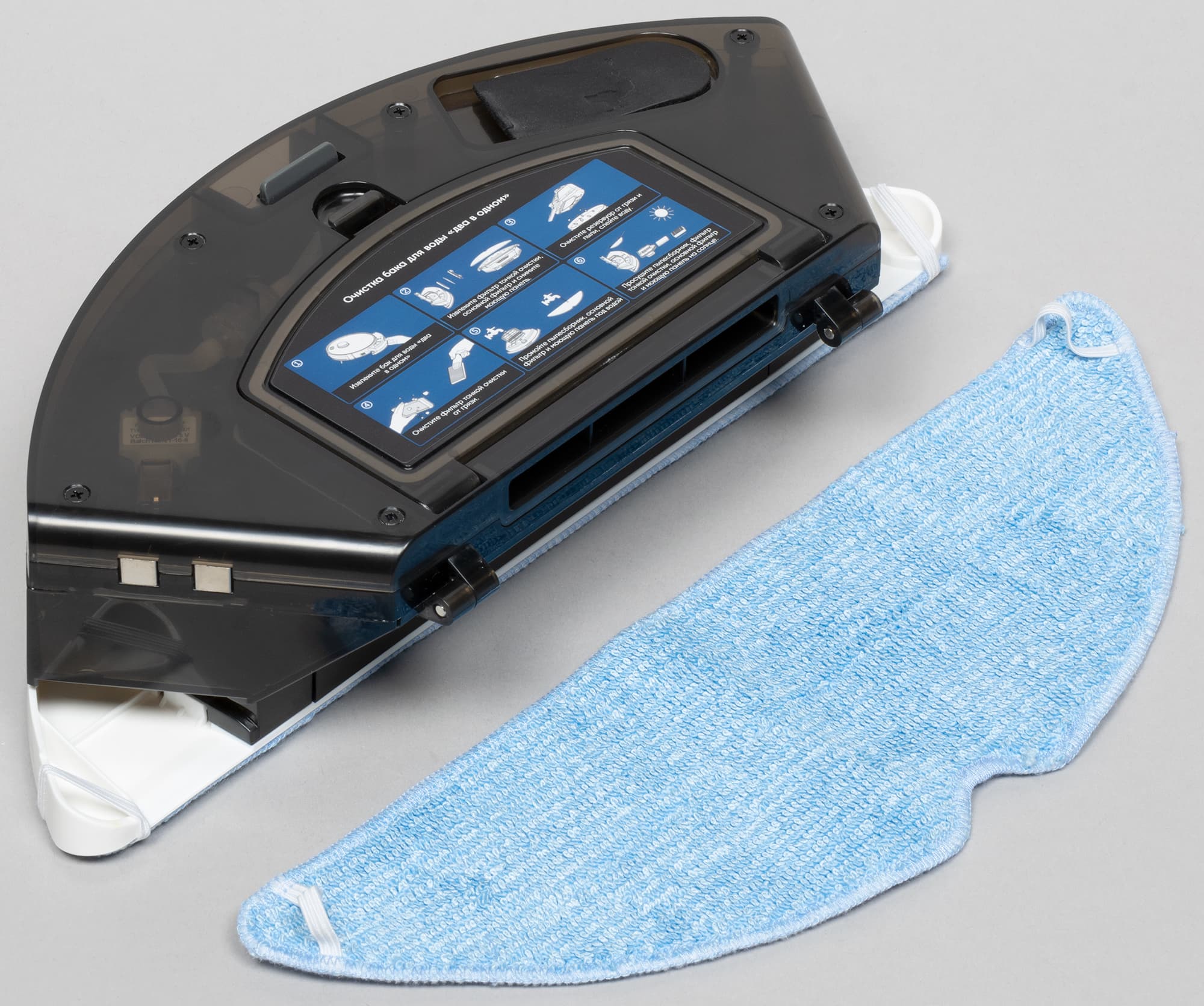 Она крепится на нижнюю часть комбинированного блока и представляет собой бак для воды, внутри которого работает небольшой насос, обеспечивающий нагнетание жидкости на подошву панели. Туда с помощью липучек-велкро крепится D-образная салфетка: ее углы дополнительно фиксируются резинками.