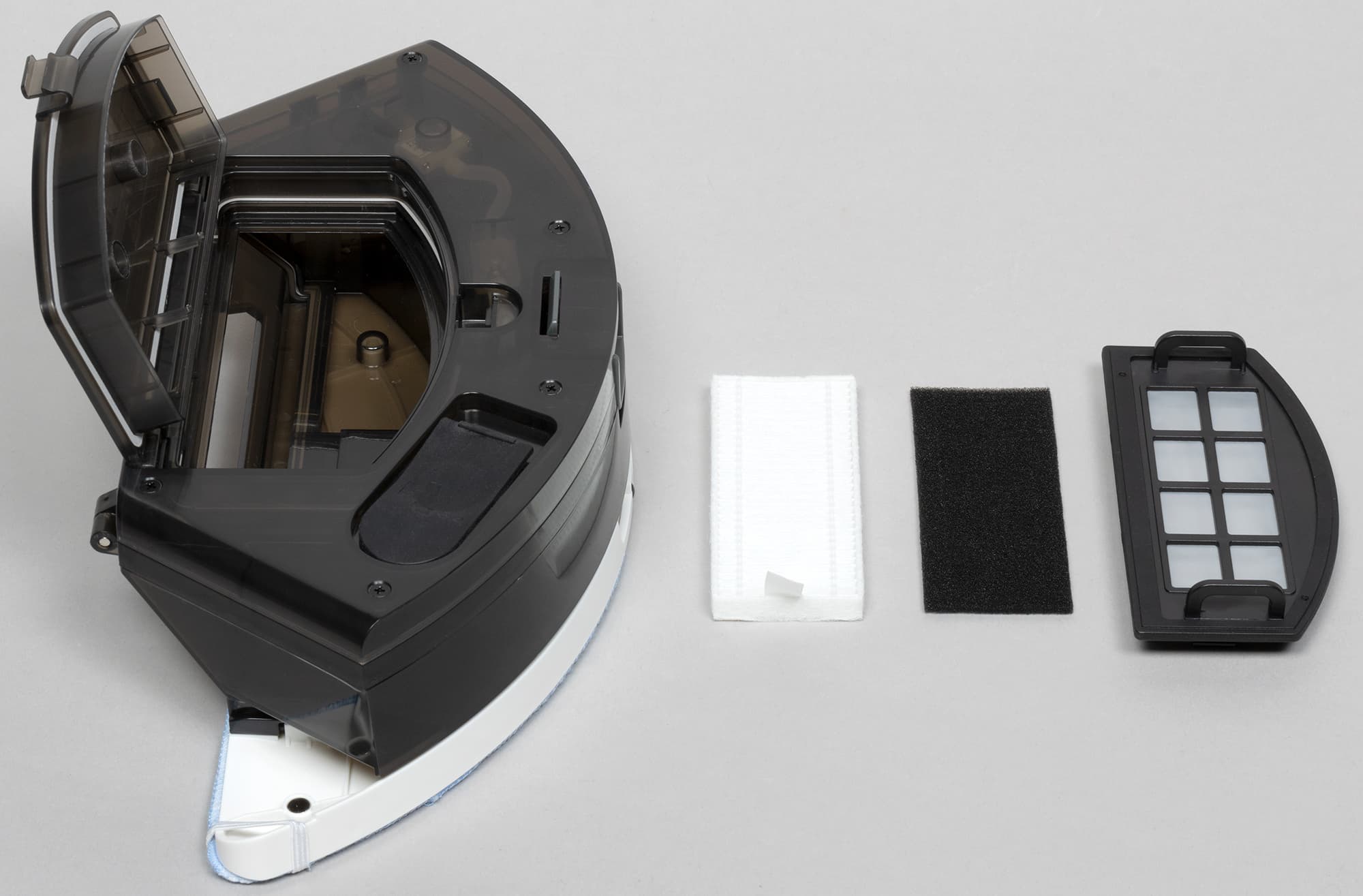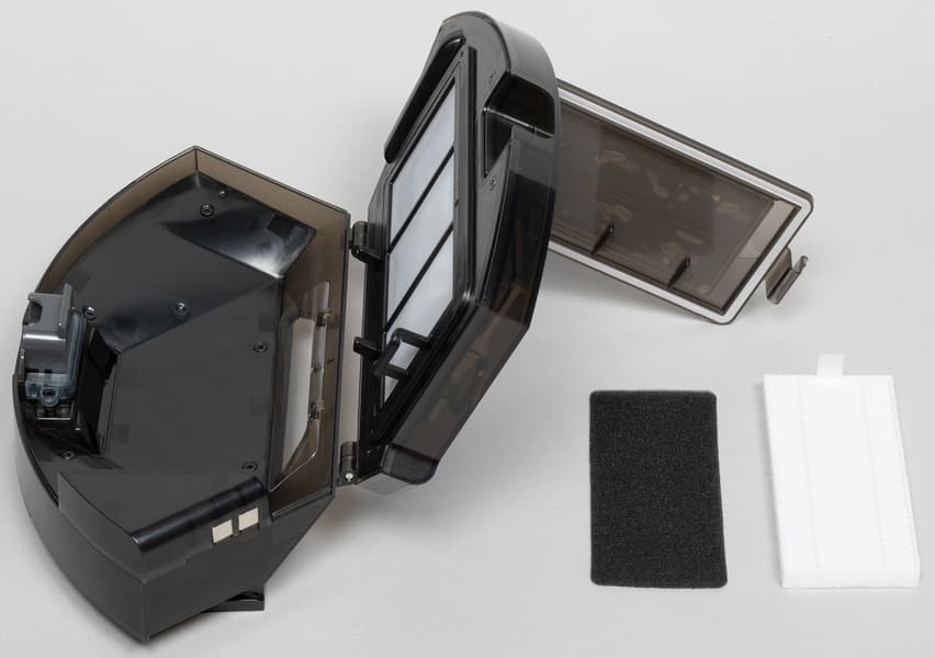Отсек мусоросборника открывается на 180°, что облегчает ручную очистку контейнера. Блок для сухой уборки снабжен двумя фильтрами: предварительным, из тонкого поролона, и основным — прямоугольным HEPA-элементом.