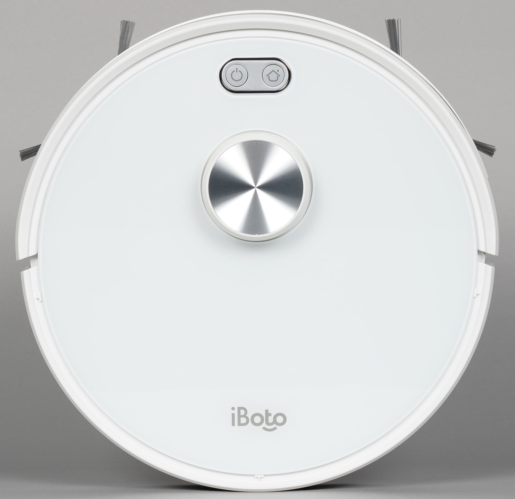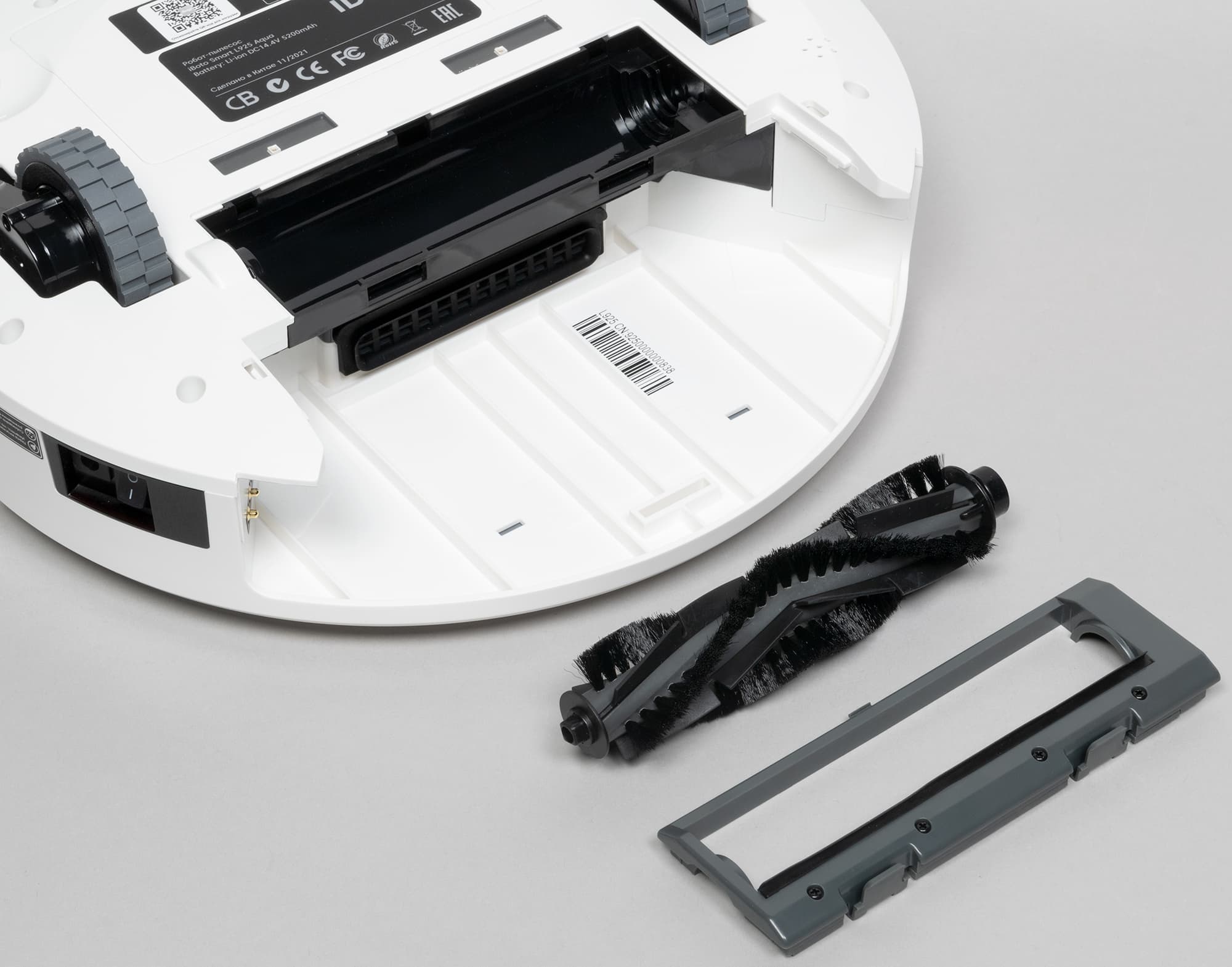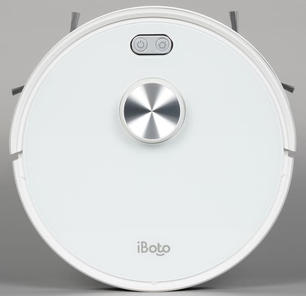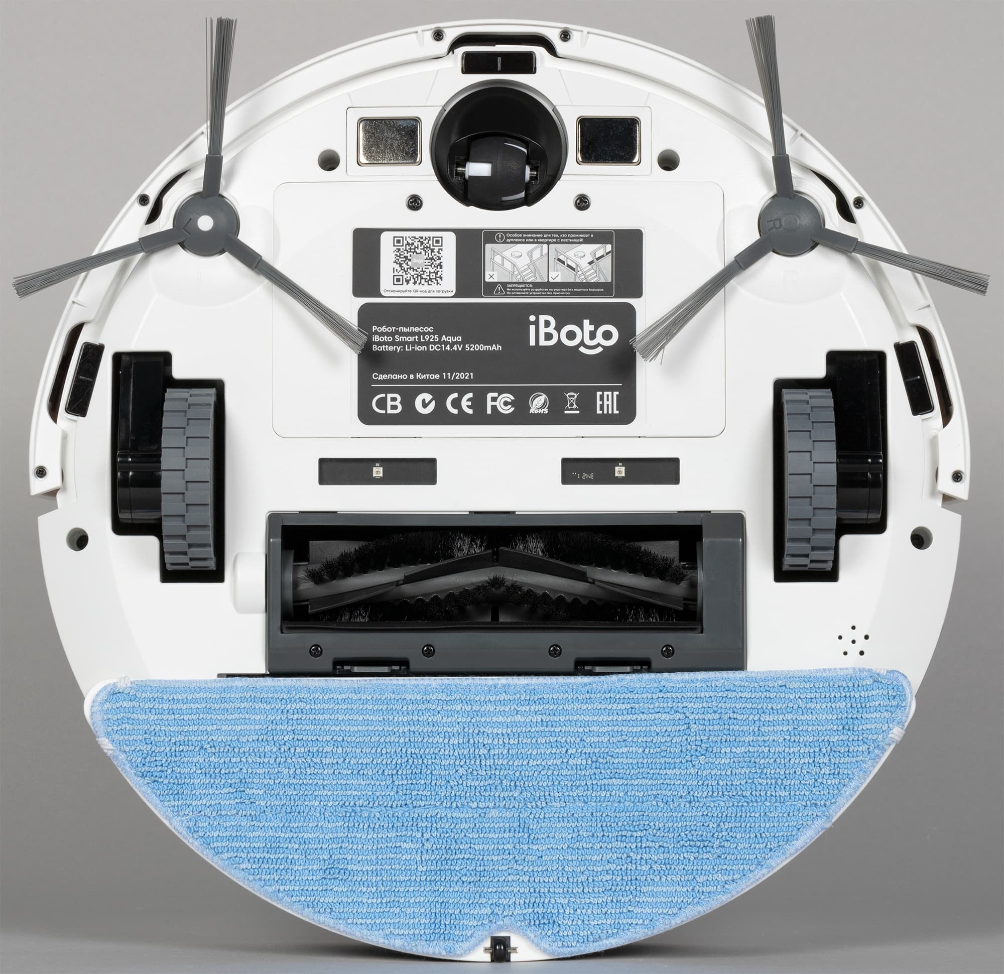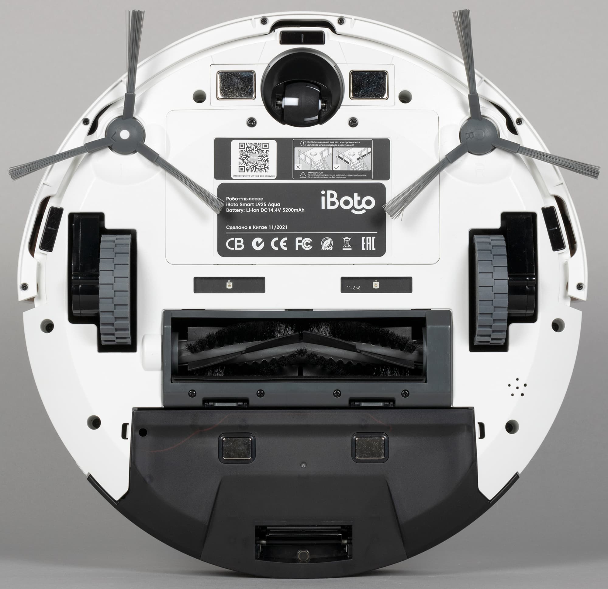 Обычно роботы-пылесосы круглые — и iBoto Smart L925 Aqua не исключение. Привычно также расположение щеток — две боковые щетки и одна центральная — и колес: два ведущих и одно поворотное спереди. Корпус белый, из декоративных элементов — только логотип.