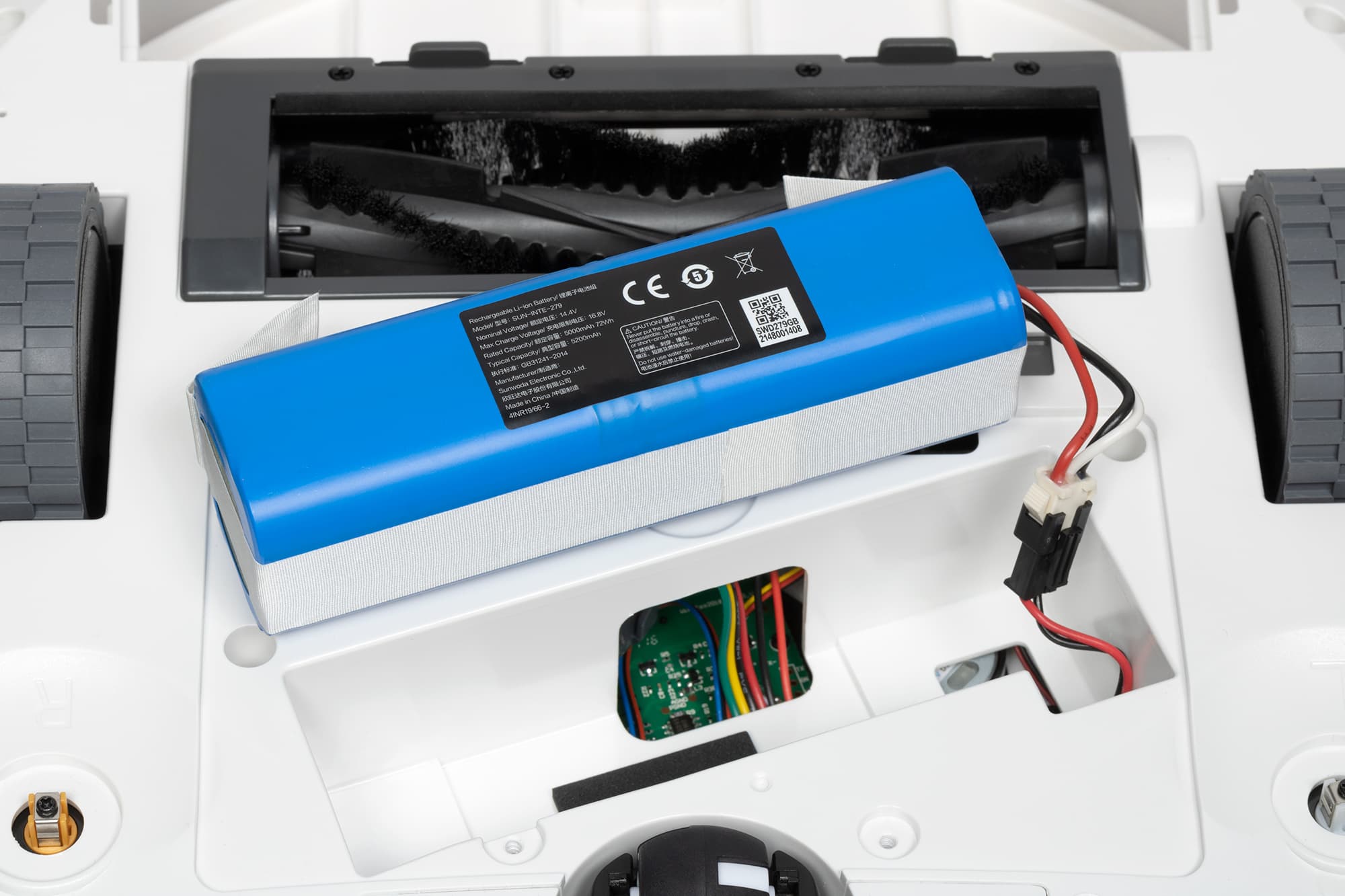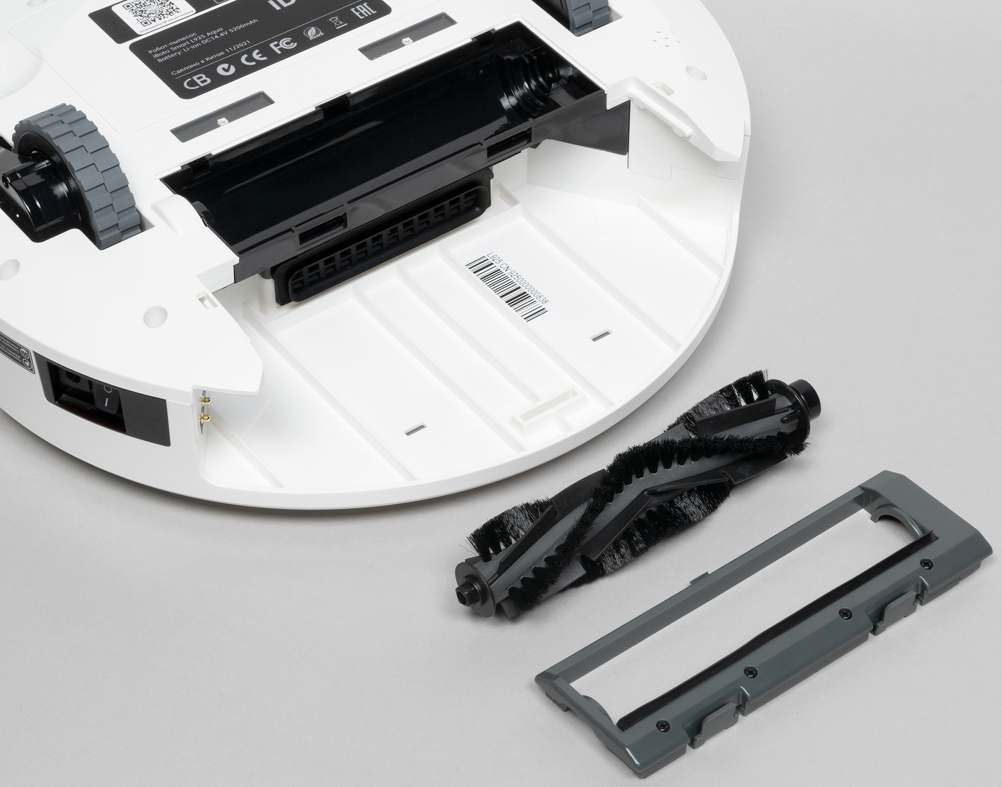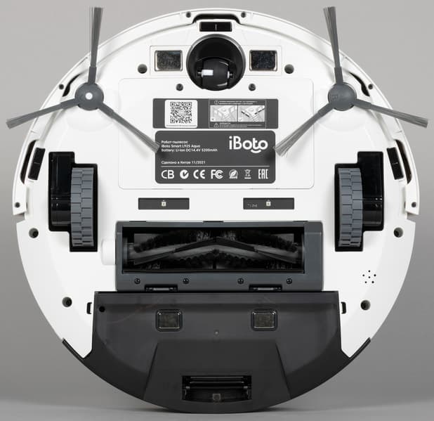 В остальном конструкция нижней части не отличается от подавляющего большинства аналогов: по периметру расположены датчики поверхности, защищающие устройство от падения с высоты, в центральной части — вращающаяся щетка, а между ней и направляющим колесом находится аккумуляторный отсек.
