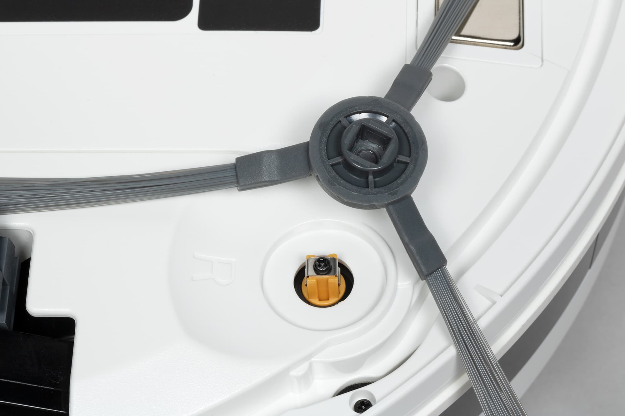 Между извлечением новенького робота из коробки и первой уборкой надо не забыть обычные для каждого бытового прибора действия: снять все упаковочные материалы — для этого типа пылесосов они включают защитные прокладки бампера. При необходимости надеть боковые щетки, сверяясь с маркировкой: «R» справа, «L» — слева. У нашего экземпляра они уже стояли на месте.