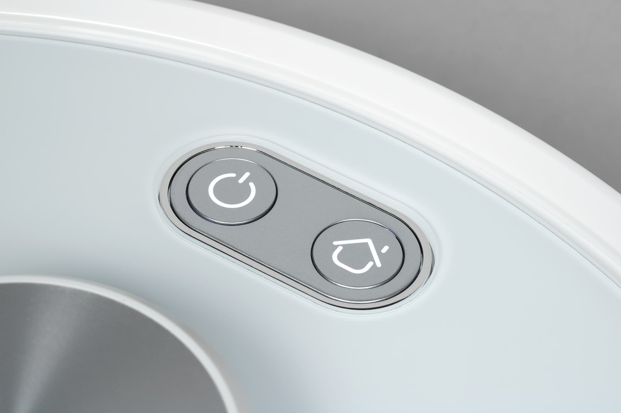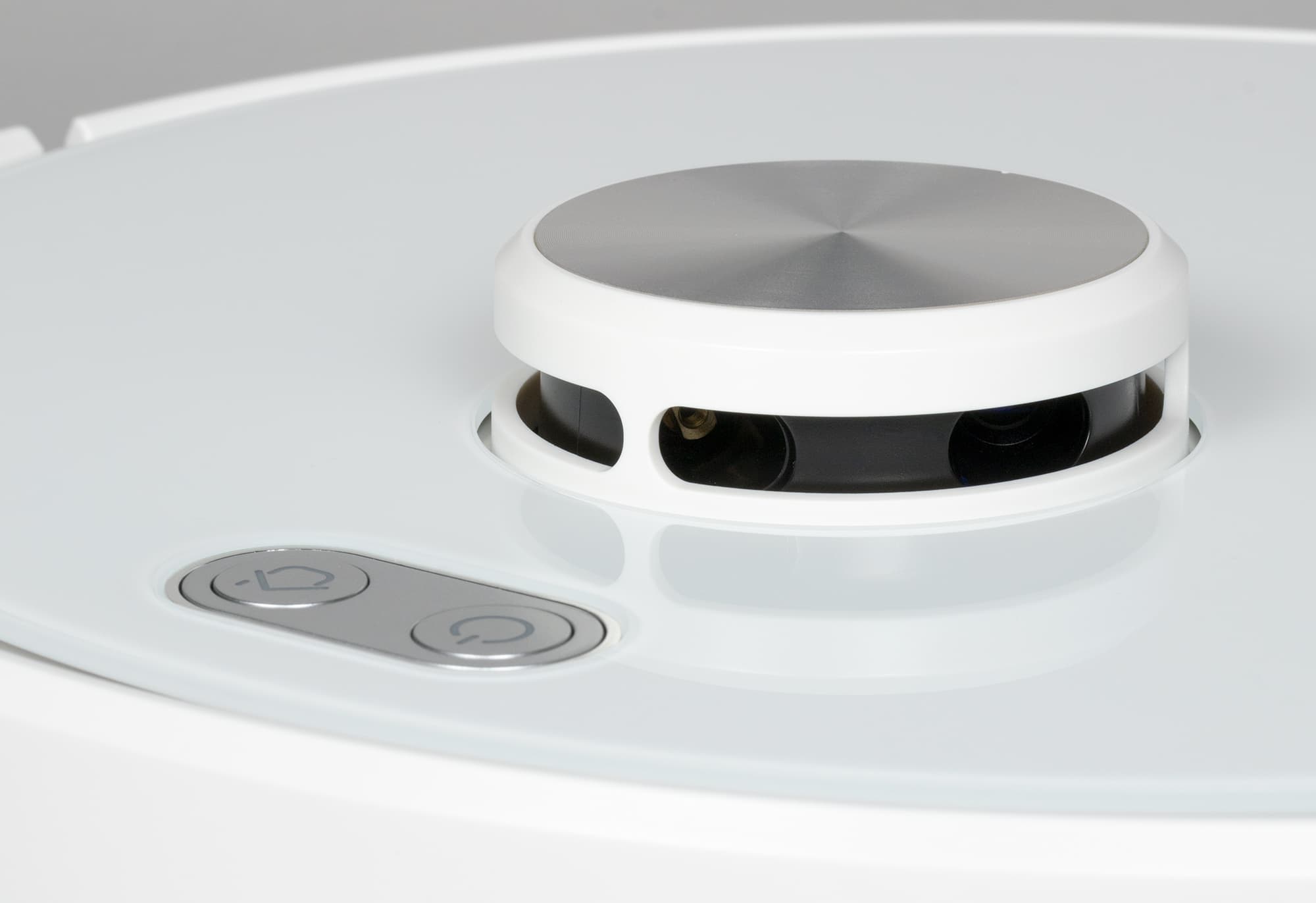 На верхней панели устройства, рядом с башенкой лидара, есть две кнопки: одна из них включает робота и запускает режим автоматической уборки, вторая предназначена для возврата на базу.