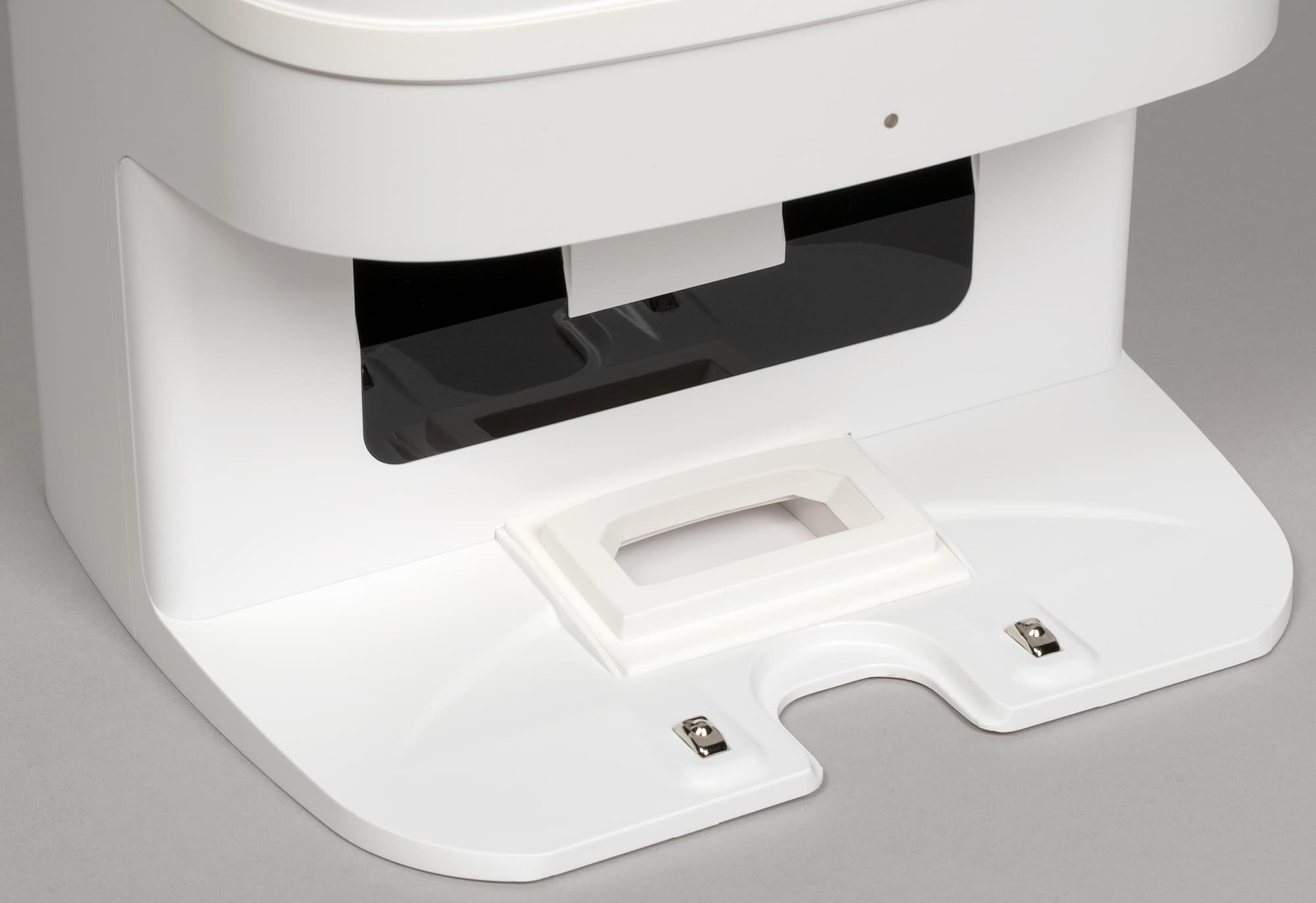 На выступе перед ней размещаются контакты для зарядки прибора и окно, через которое происходит самоочистка. Пыль и мусор удаляются из мусоросборника робота с помощью пневматики: для этого предназначен воздушный насос внутри базы.