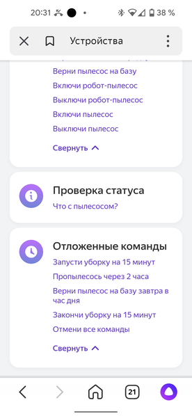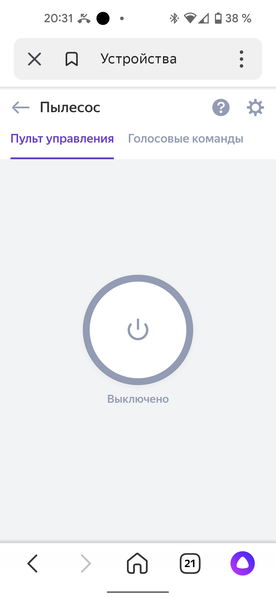 Виртуальный «пульт управления» представляет собой единственную кнопку, включающую уборку в автоматическом режиме. Гораздо больше возможностей предоставляет вкладка «голосовые команды», в которой приведены примеры взаимодействия пылесосом с помощником.