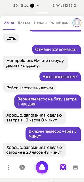 С помощью устных команд мы можем включить и выключить автоматическую уборку, узнать о статусе пылесоса, а также запланировать работу по расписанию.
