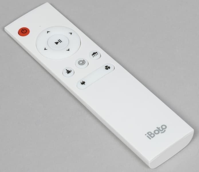 В комплекте с моделью поставляется небольшой инфракрасный пульт. Кнопки навигации в средней части позволяют управлять движением робота вручную, а центральная запускает уборку в автоматическом режиме (повторное нажатие приостанавливает работу).