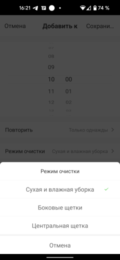 Пункт «Время» позволяет настроить уборку по расписанию. Возможности регулирования тут весьма широки: устройство можно запустить в нужное время указанного дня недели (допускается также установка однократных значений), для каждой задачи — указать интенсивность всасывания, расход воды, количество проходов по помещению, а также управлять режимом подметания: при желании для каждой запланированной задачи можно отключить боковые или центральную щетку.