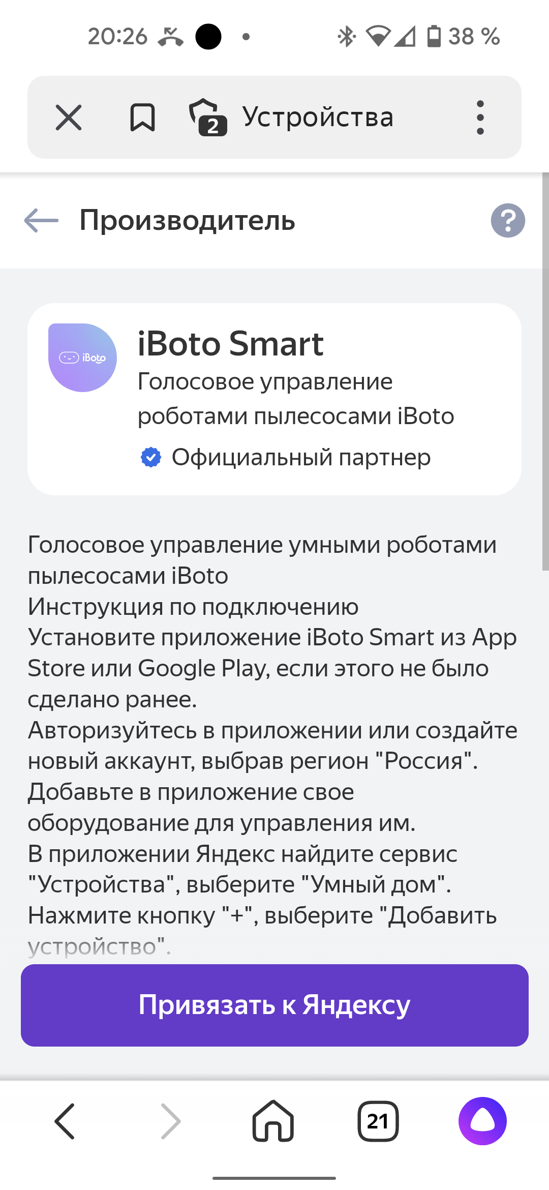 Производителем заявлена поддержка нескольких популярных систем умного дома: кроме собственной экосистемы iBoto Smart, пылесос работает с Tuya Smart, Amazon Echo, Google Home и «Алисой». На примере голосового ассистента от Яндекса мы и познакомимся с коммуникационными возможностями устройства и приложения.