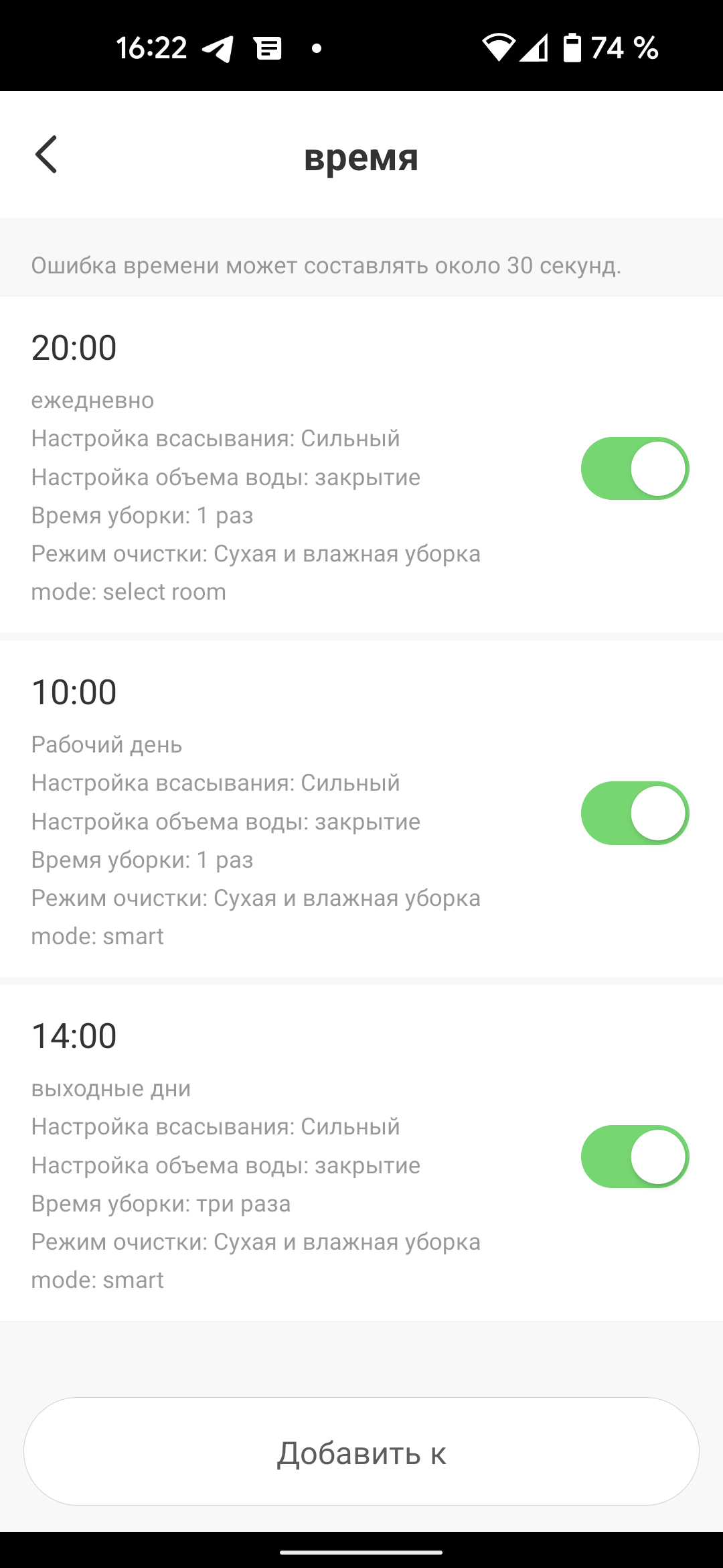 Нам показалось удобным настроить утреннюю уборку всей квартиры по рабочим дням в десять утра, а по выходным, когда хочется подольше поспать, — в полдень. После того, как пылесос построит карту помещения, появляется возможность указывать для уборки конкретную комнату. В нашем случае добавлена третья задачу: подметать в кухне после ужина, в восемь вечера.