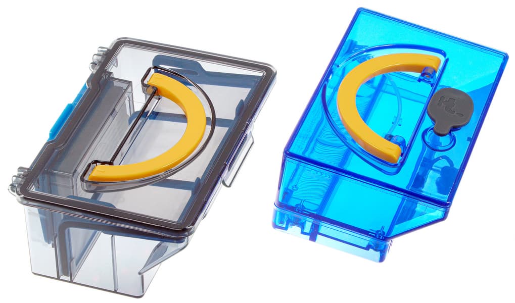 Блок для влажной уборки той же формы, но сделан из голубого пластика. Вода из него самотеком поступает на отверстия в дне пылесоса, через которые увлажняет тряпку, протирающую пол.