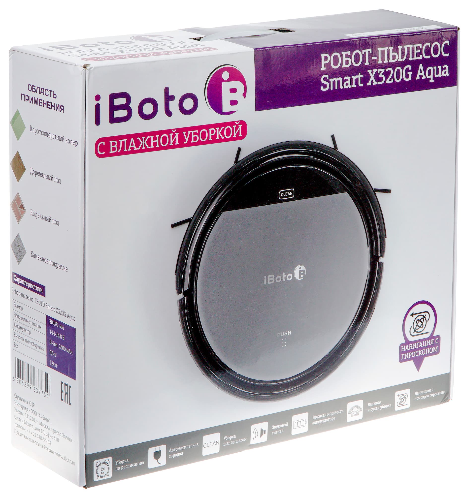 Лицевую сторону упаковки украшает фотография модели, а в нижней части перечислены основные достоинства устройства: уборка по расписанию, влажная и сухая уборка и навигация с помощью гироскопа.