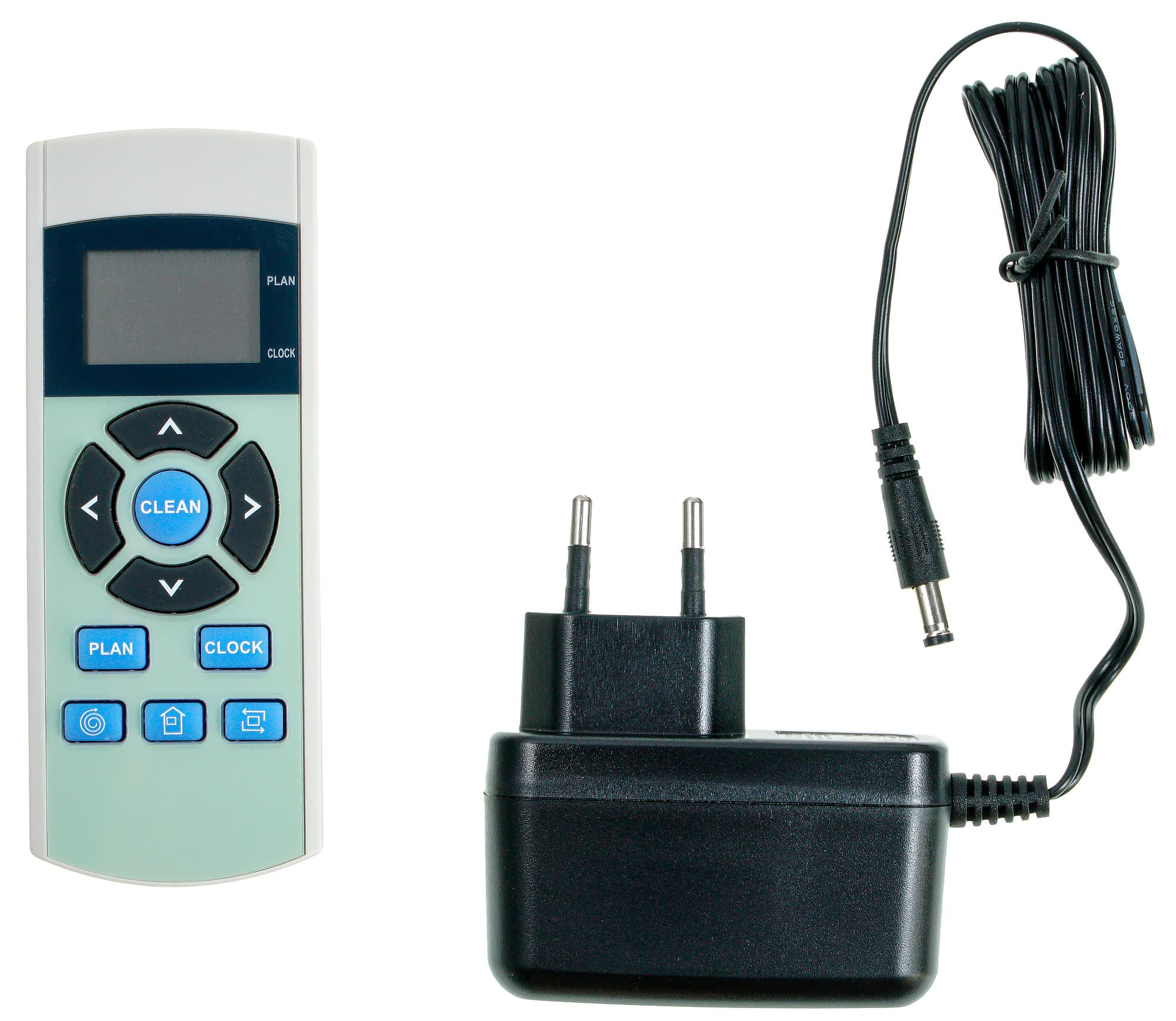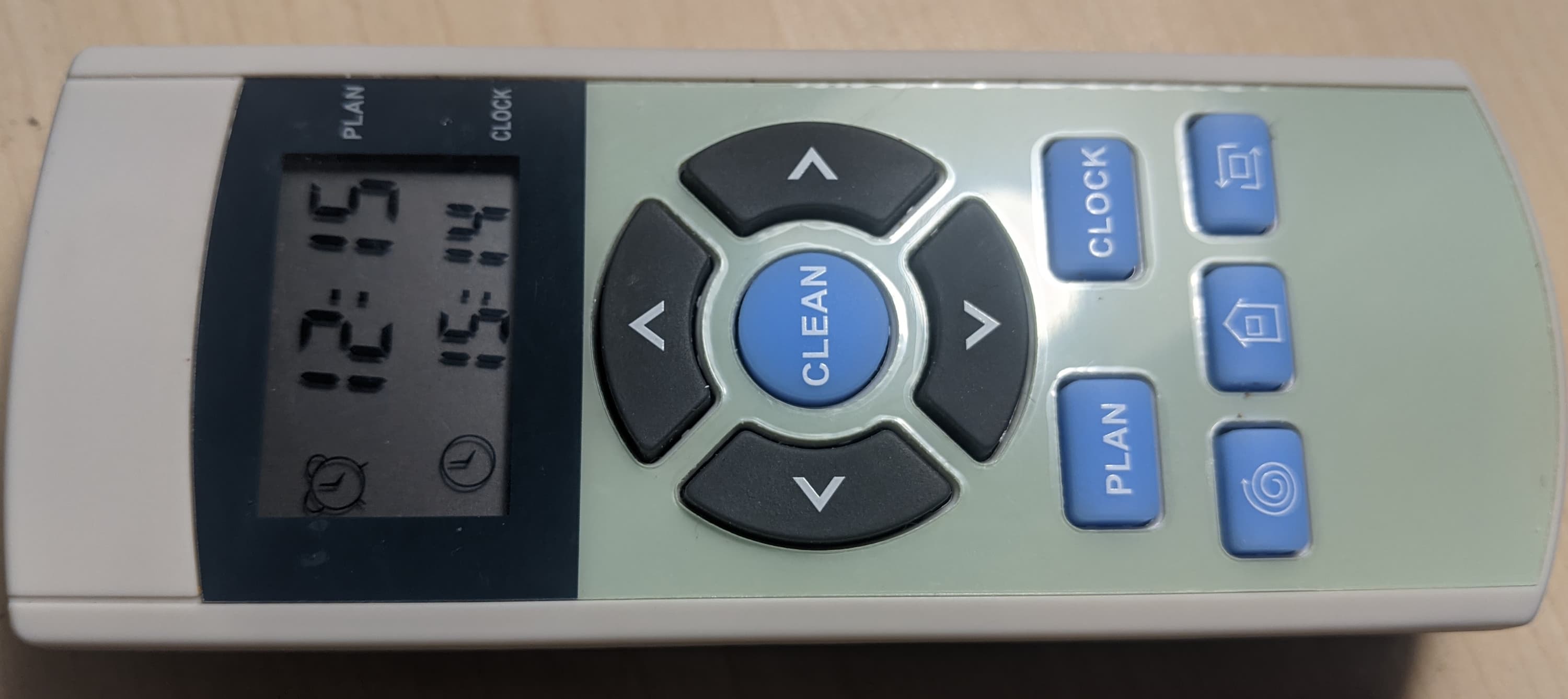 На небольшом дисплее пульта отображаются текущее время и время начала уборки по расписанию, если таковое задано пользователем. Установка времени и планирование уборки производятся соответственно кнопками Clock и Plan. Оба значения времени выводятся в 24-часовом формате.
