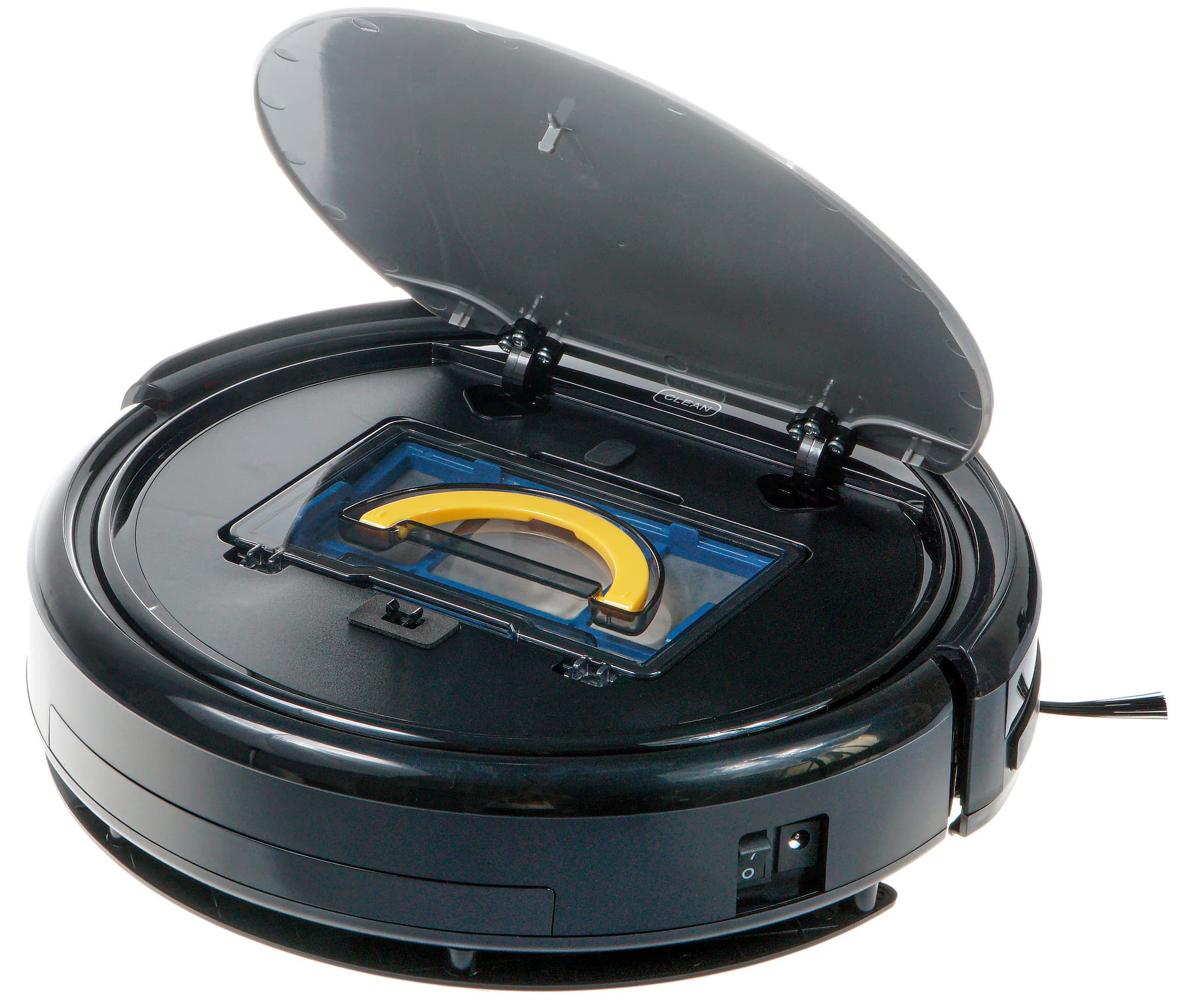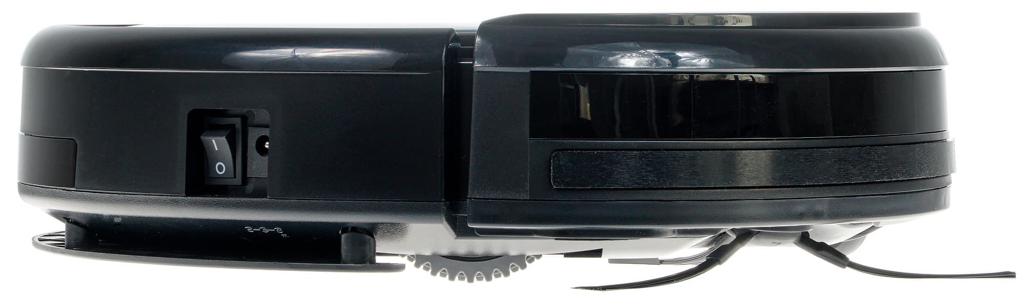 Устройство бампера обыкновенное: переднее подпружиненное полукольцо закрыто ИК-прозрачным пластиком, за которым скрываются датчики приближения. Чуть ниже размещается полоса из резины, смягчающая неизбежные удары о мебель. Инфракрасные датчики есть и на корме пылесоса, это должно облегчать поиск базы. На правой боковой стороне находится выключатель, а рядом с ним — штекер зарядного устройства. При необходимости пылесос можно заряжать непосредственно от адаптера постоянного тока. Это может быть удобно в небольших помещениях, где нет возможности выделить на полу специальный участок, чтобы поставить базу.