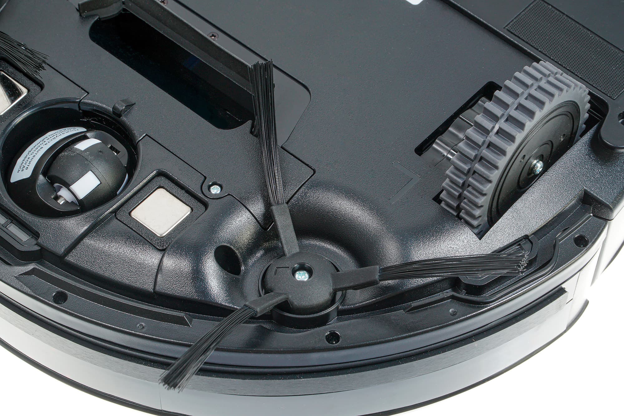 После извлечения пылесоса из коробки следует, разумеется, удалить с него наклейки и транспортировочные прокладки, защищающие бампер. Боковые щетки нужно установить, соблюдая направление изгиба ворса: щетку с маркировкой «L» на левую ось, а щетку «R» — на правую.