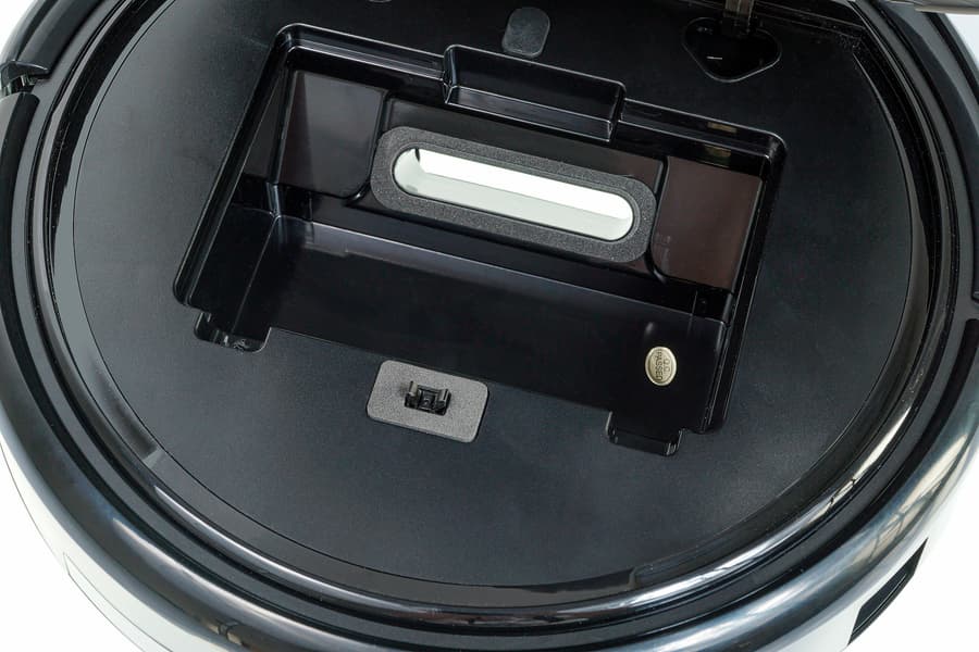 Контейнер для мусора с фильтром расположен нестандартно: под верхней панелью устройства. Чтобы добраться до мусоросборника, на верхнюю крышку следует нажать в области надписи Push, и подпружиненная панель откинется, открыв нишу контейнера.