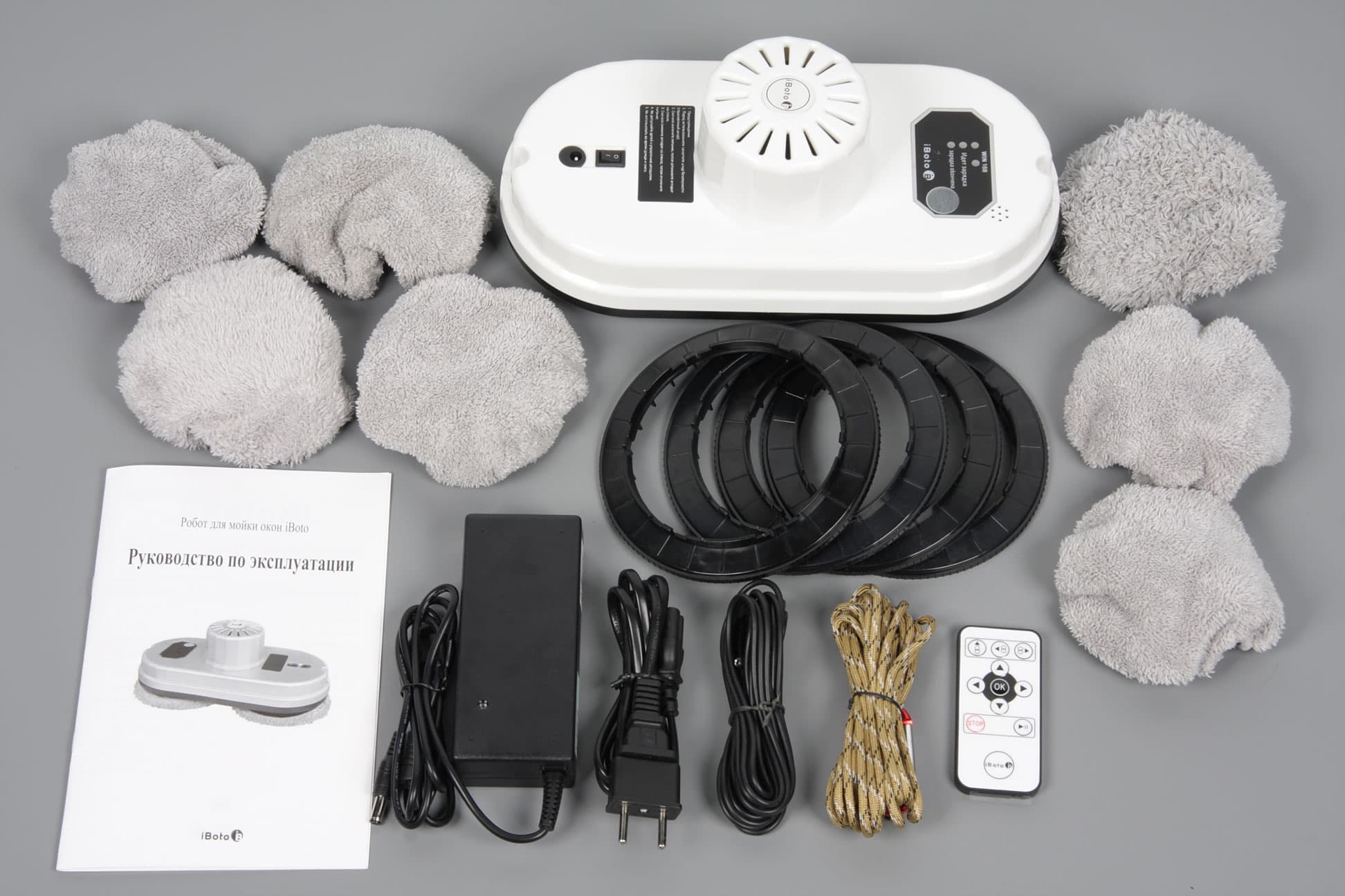 Чехла или сумки нет, поэтому эта коробка, скорее всего, будет использоваться для хранения робота и для его доставки к месту выполнения работ. Комплект поставки включает в себя напечатанное руководство пользователя, самого робота, четыре кольца-насадки, 14 сменных многоразовых салфеток, блок питания, сетевой кабель, удлинитель низковольтного питания, страховочный шнур с карабином, и пульт ДУ.
