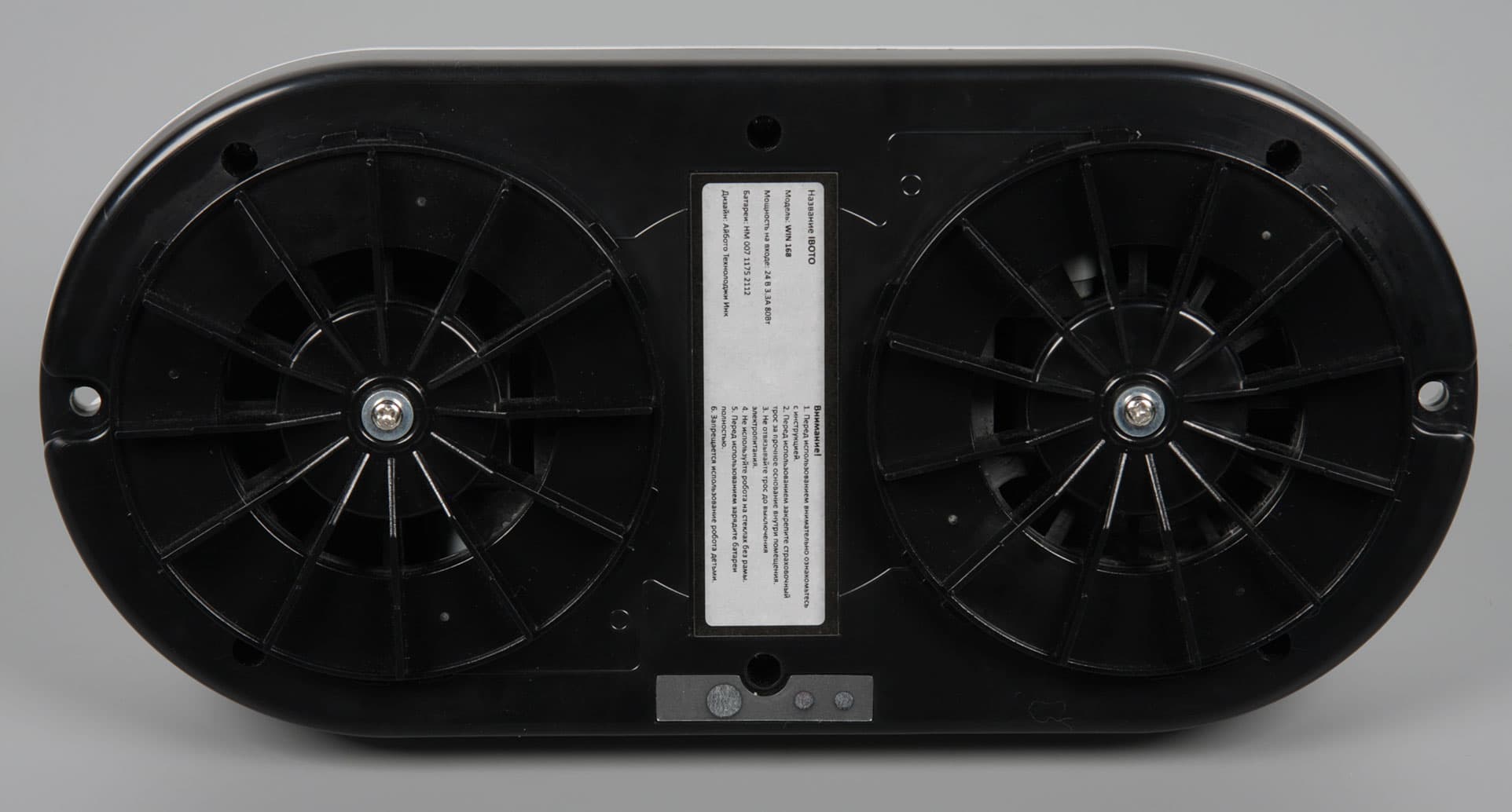 Верхняя половина корпуса — белая, а нижняя — черная. Корпус немаркий, мелкие повреждения на нем незаметны, и его легко очищать. На верхней панели расположены индикаторы состояния, окошко ИК-приемника, решетка звукового сигнализатора, механический выключатель питания и разъем низковольтного питания.