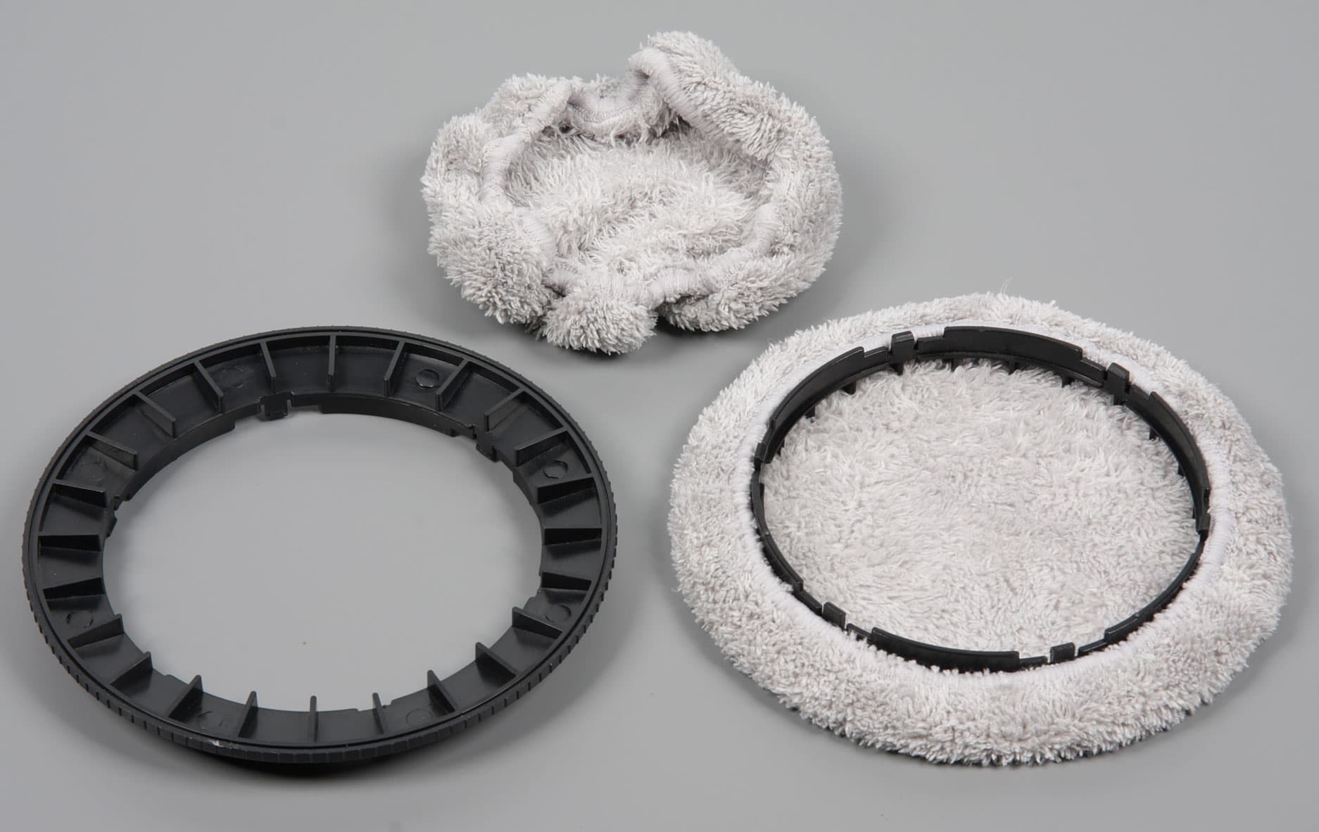 Круглой формы чистящие салфетки изготовлены из синтетической микрофибровой махровой ткани с двухсторонним ворсом средней длины. В край салфеток вшит резиновый шнур, что позволяет закрепить салфетку в растянутом состоянии на пластиковом кольце.
