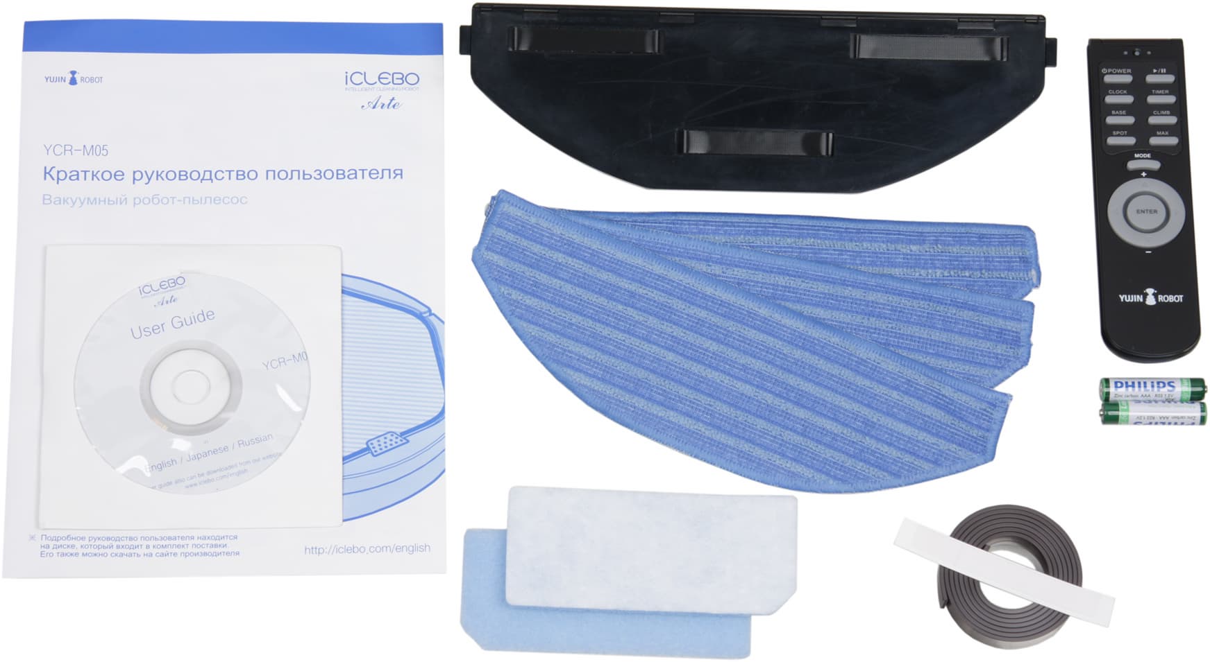 Набор аксессуаров, входящих в комплект поставки, довольно неплохой, он включает в себя сменные фильтрующие элементы, протирочные насадки и ограничительную ленту.