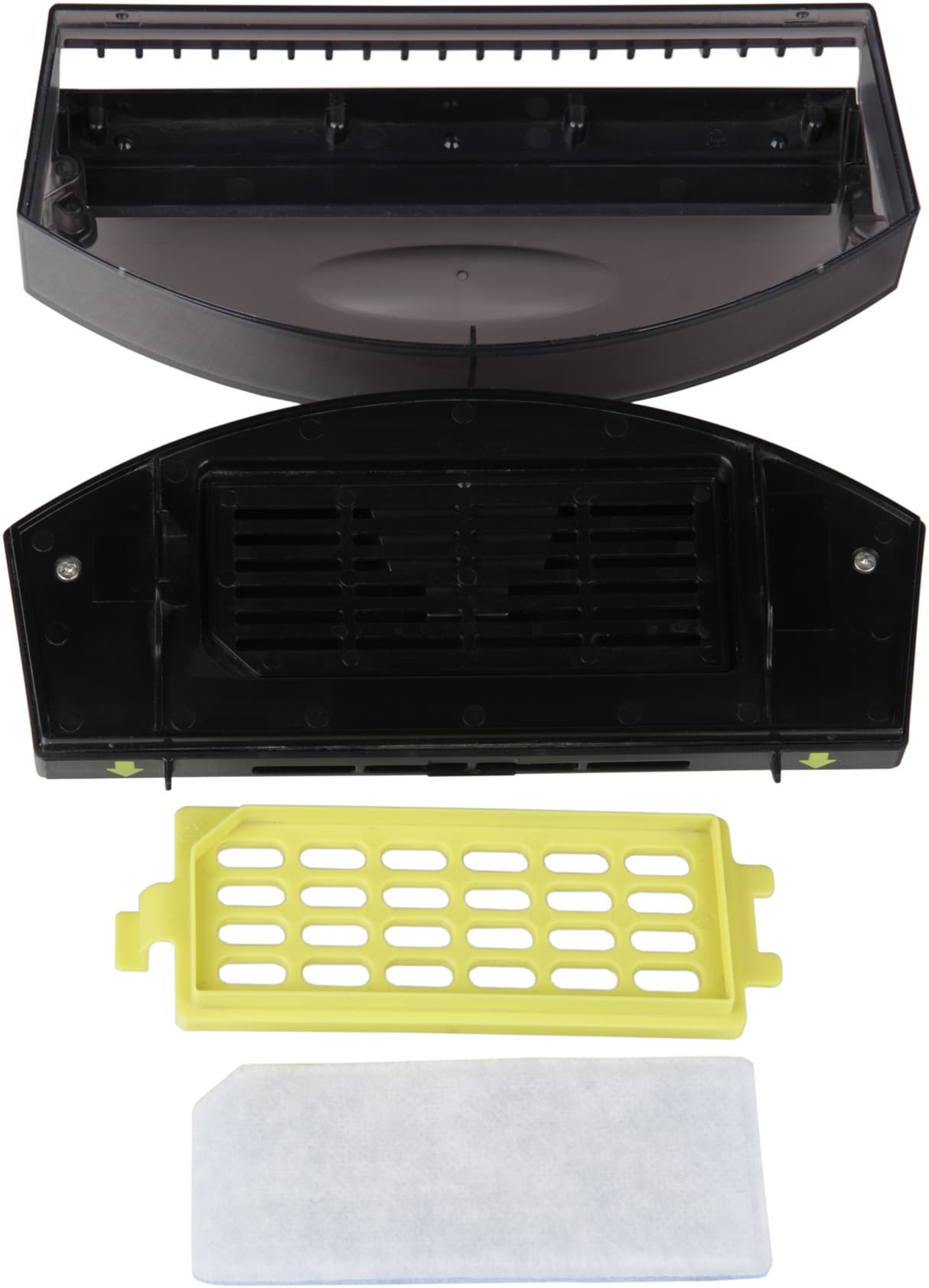 Очищать пылесборник очень просто и удобно: снимается верхняя крышка и пыль вытряхивается. Также можно откинуть скребок на шарнире и вытряхнуть пыль через открывшуюся щель, но смысла в этом нет, так как первый вариант гораздо удобнее. При необходимости вынимается и очищается фильтр, прижатый желтой пластиковой решеткой.