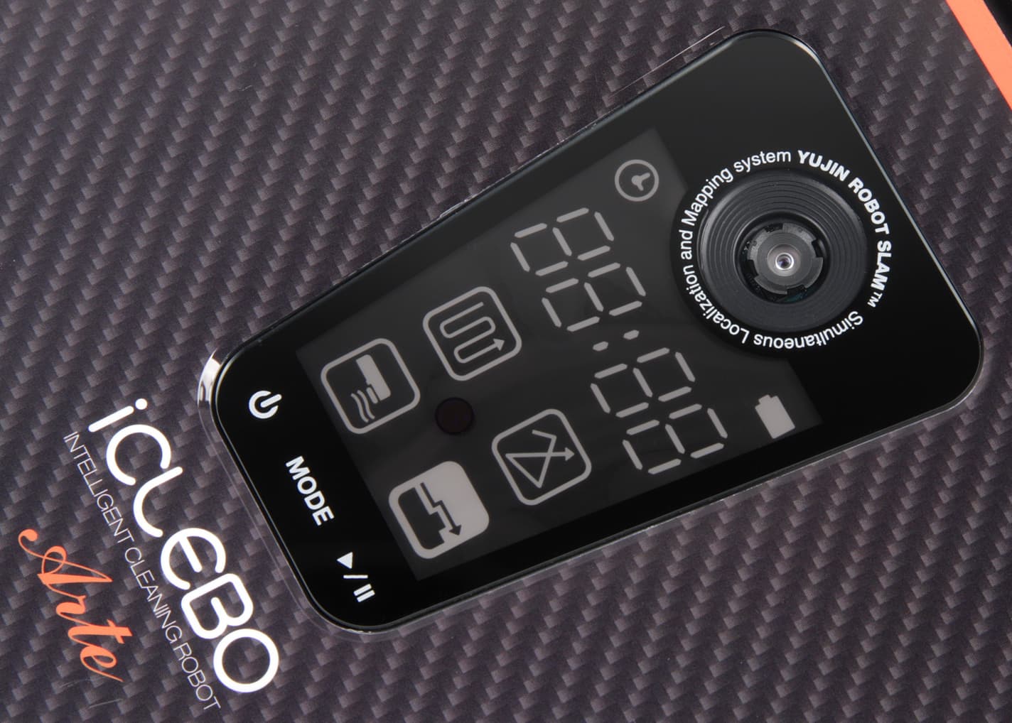 Переход прямым углом от верхней панели к боковой поверхности снижает вероятность того, что пылесос будет застревать под препятствиями с небольшим просветом. Сверху корпус прикрыт панелью из прозрачного пластика, рисунок под которой имитирует переплетение кевларового волокна. На верхней панели ближе к передней части корпуса находится контрольная панель с тремя емкостными сенсорными кнопками, светодиодным сегментным дисплеем и иконками режимом/состояния подсвечиваемыми светодиодами.