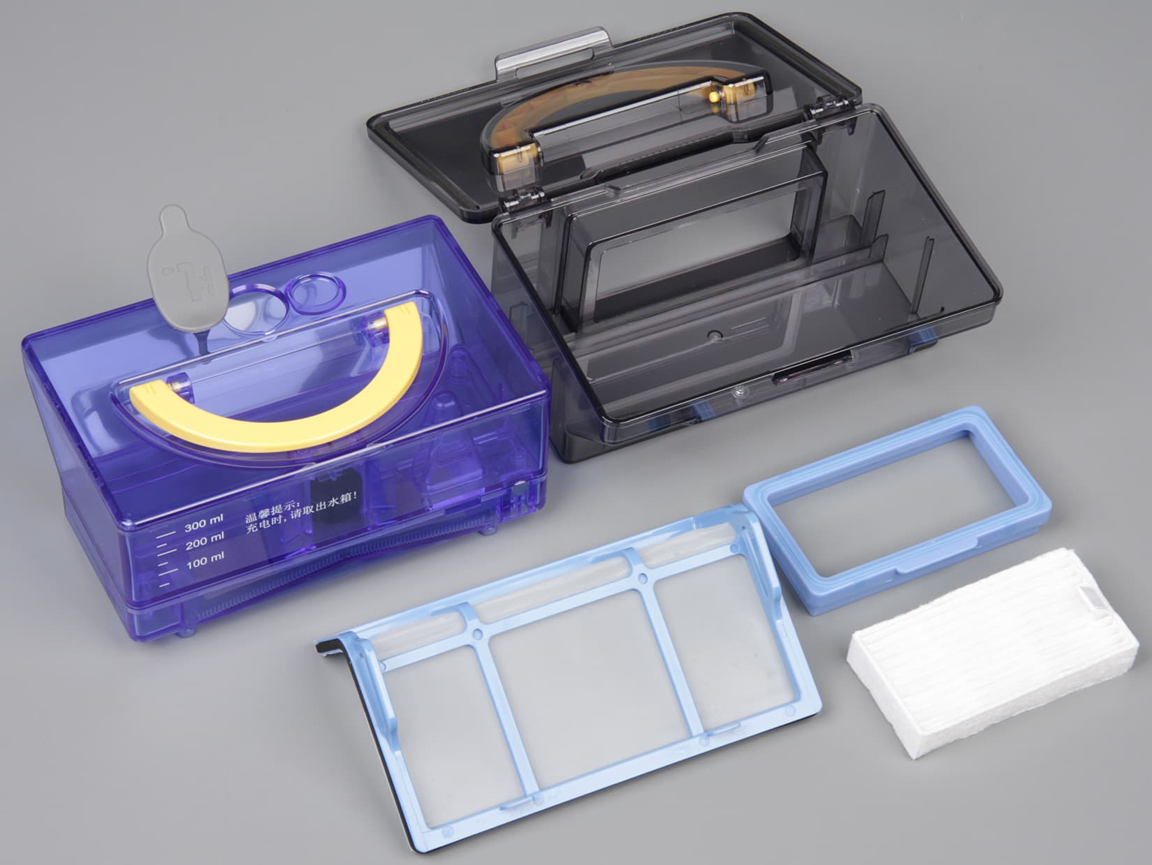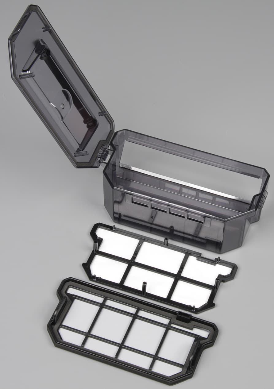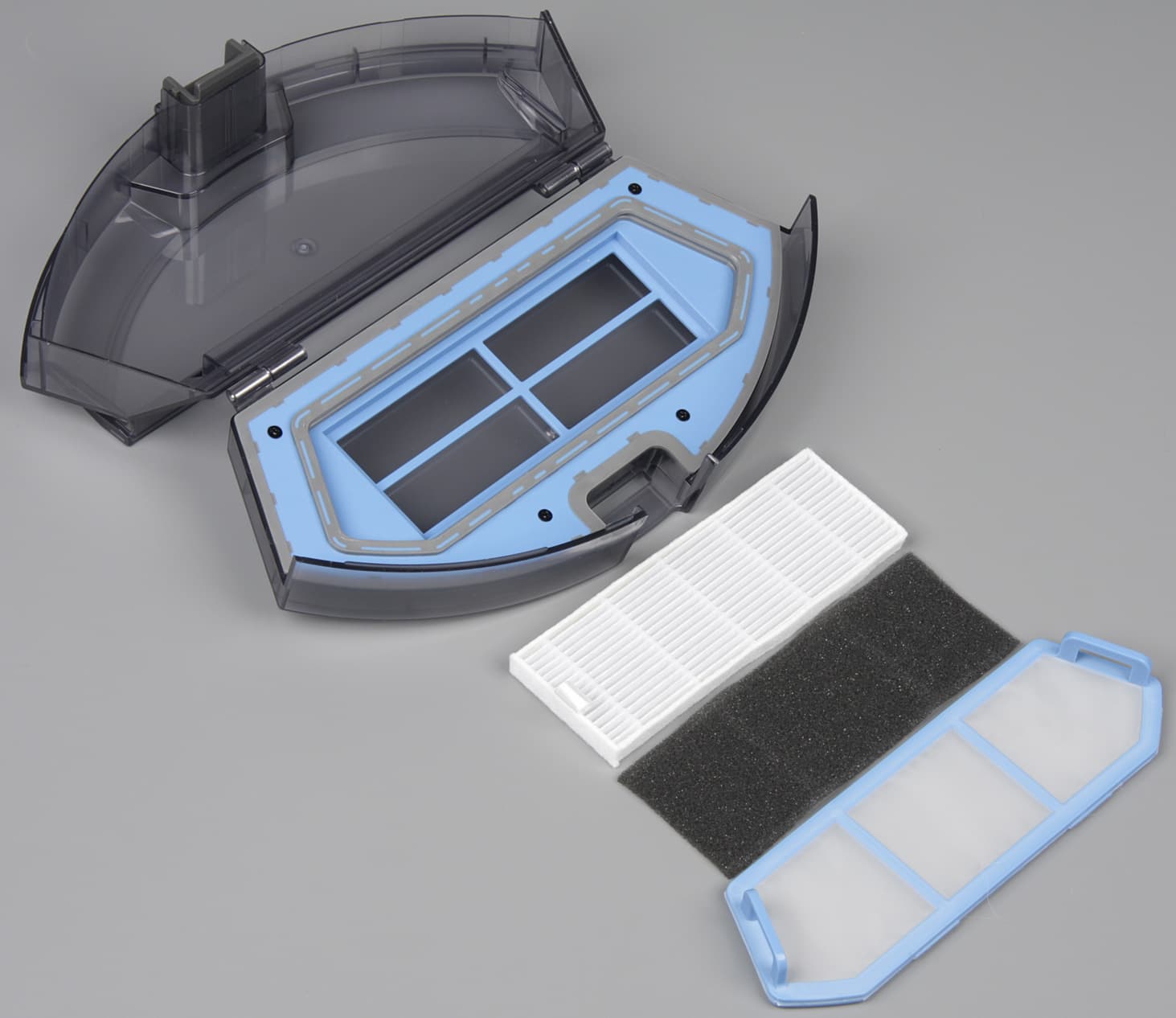 Пылесборник iLife X5 — пластиковая сеточка и складчатый фильтр в рамке (слева — упомянутый выше контейнер для жидкости):