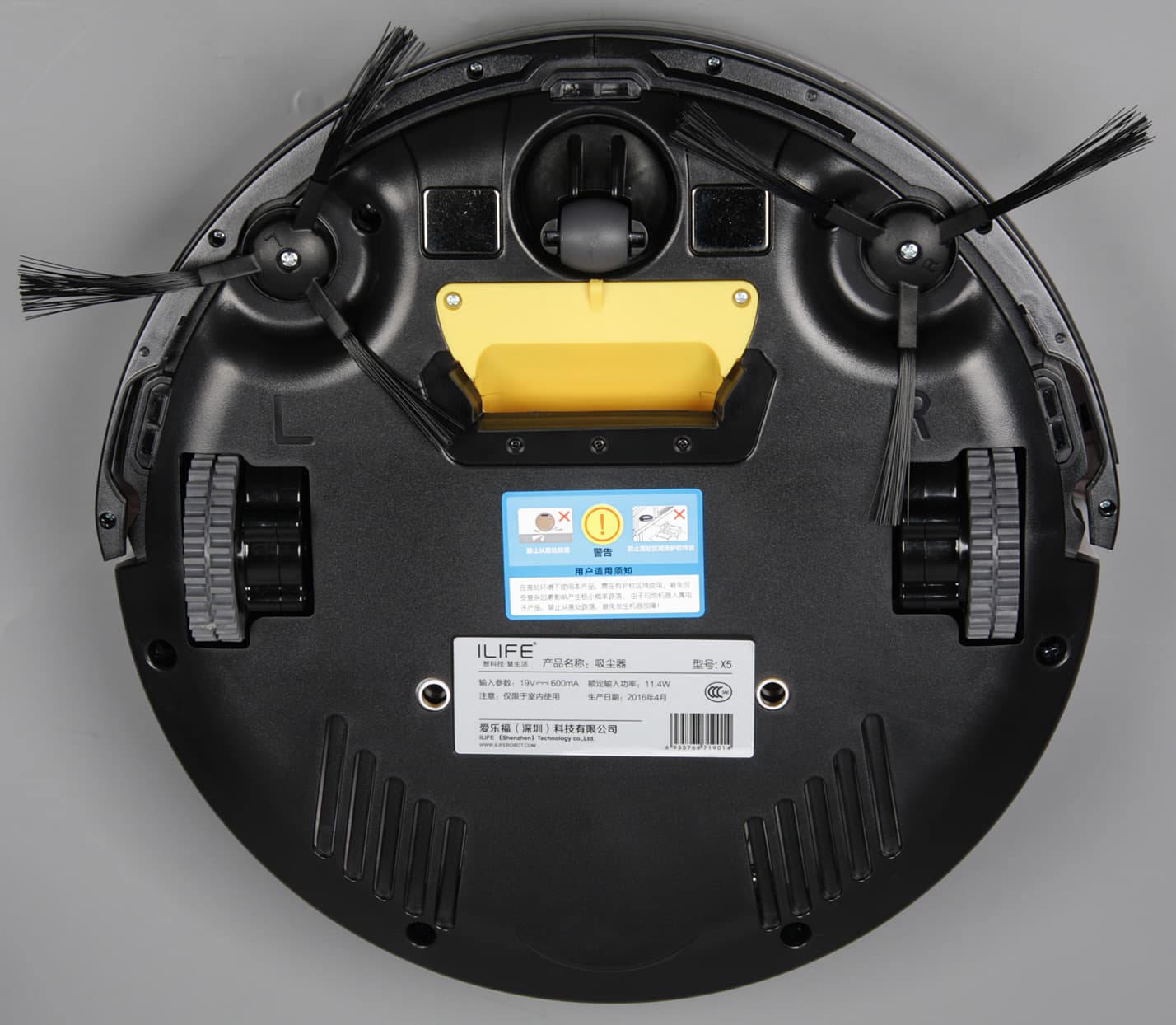 iLife X5 — левая боковая щеточка вернулась на место, но основной щетки не стало совсем, вместо нее всего лишь воздухозаборник с резиновой юбочкой: