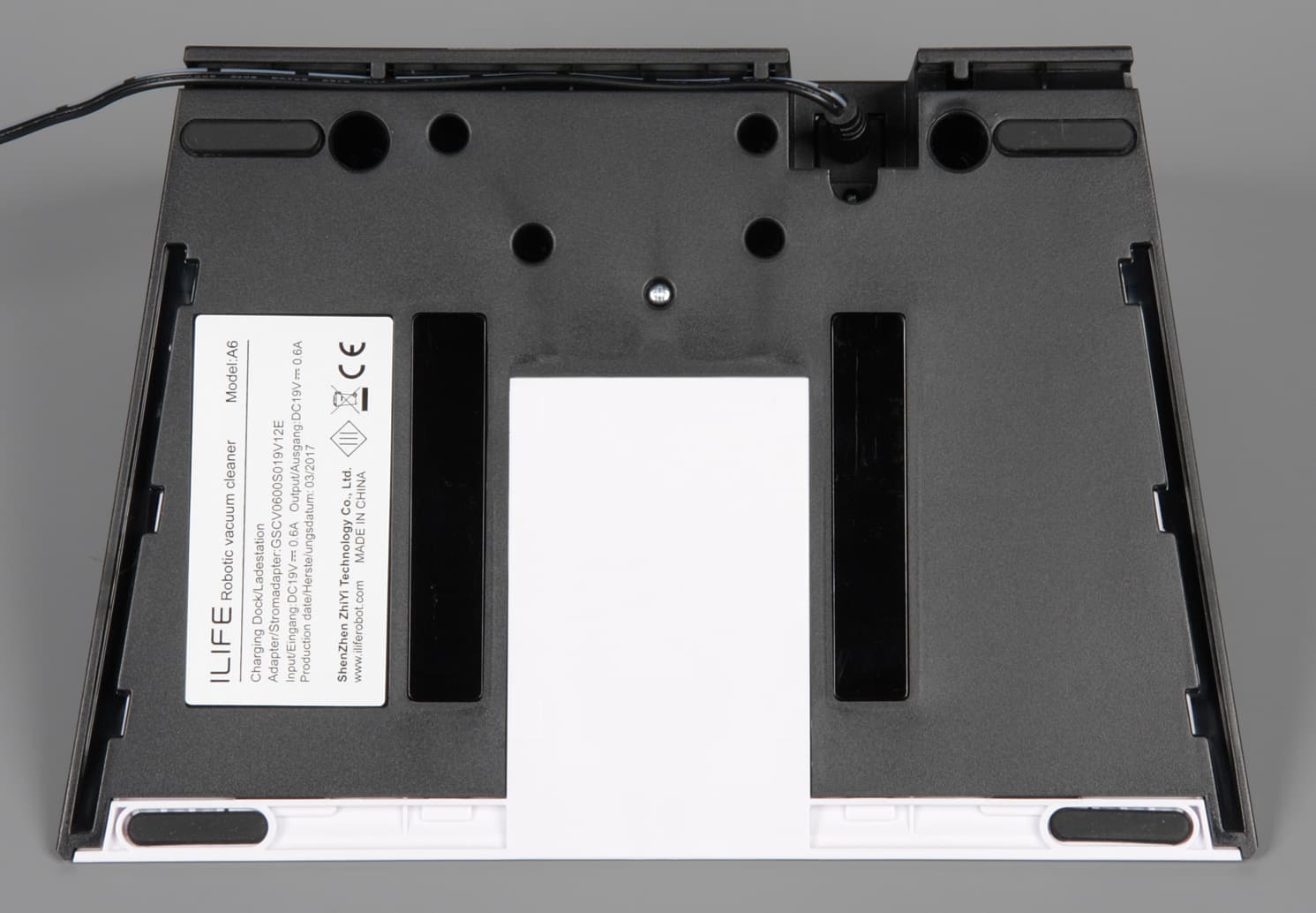 Питается база от внешнего адаптера питания, который также можно использовать для зарядки робота, минуя базу, если по какой-то причине она недоступна. Кабель можно уложить в каналы на днище базы и вывести на правую или на левую сторону.