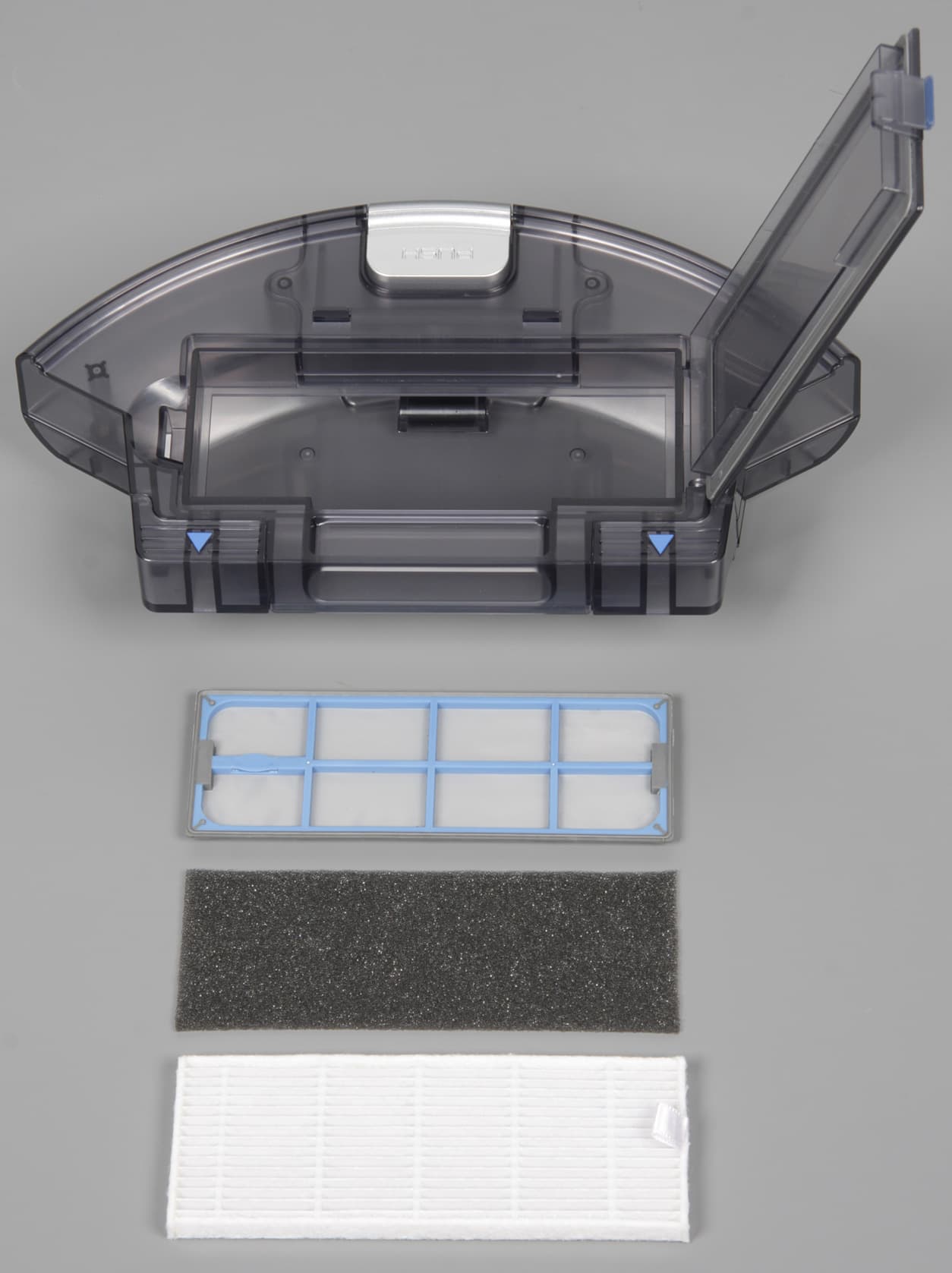 В закрытом положении передняя крышка удерживается магнитными фиксаторами. Для полной очистки нужно открыть верхнюю крышку пылесборника и вынуть сначала складчатый фильтр тонкой очистки, потом поролоновый фильтр и следом предварительный сетчатый фильтр.