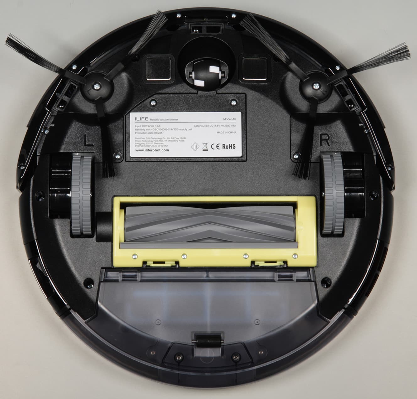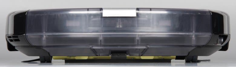 На днище расположены две контактные площадки, передний опорный поворотный ролик, боковые щеточки, крышка батарейного отсека, два ведущих колеса, отсек основной щетки. Ближе к краю сразу за бампером расположены три ИК-датчика перепада высоты, благодаря которым робот-пылесос может избежать падения со ступенек.