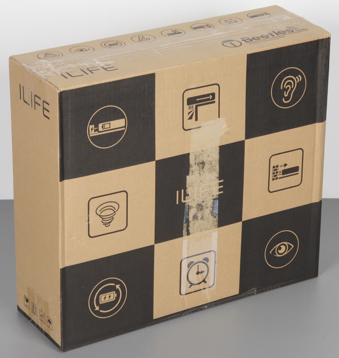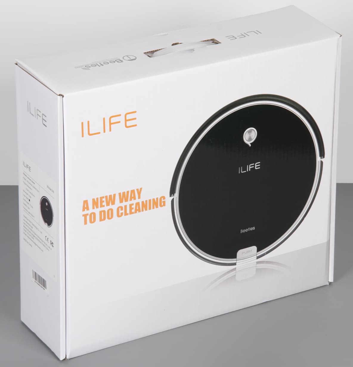 Робот-пылесос iLife A6 упакован в две коробки — внешнюю защитную из толстого гофрокартона, и внутреннюю из картона потоньше и уже с ручкой.