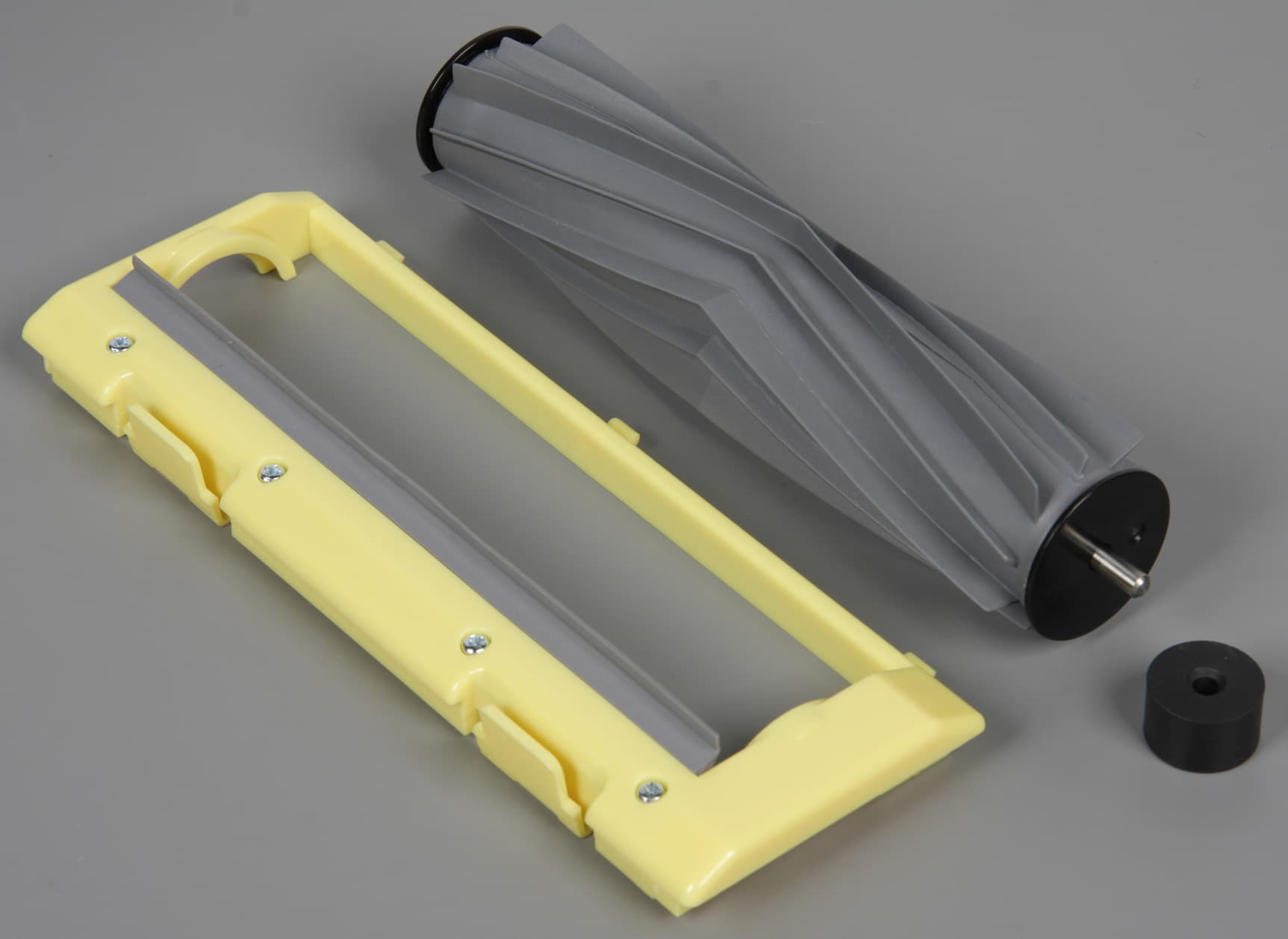 С нашей точки зрения такая многоступенчатая система фильтрации избыточна и только снижает воздушный поток, хватило бы и одного фильтра-сеточки. В любом случае, поролоновый уж точно лишний. Впрочем, в ходе тестов на первом фильтре собиралось много легкого мусора (и это с чистого пола), то есть мощность всасывания даже со всеми фильтрами относительно высокая. Отметим, что вентилятора в самом пылесборнике нет, поэтому пылесборник и два фильтра (кроме складчатого) можно мыть под водой, главное потом все хорошо высушить. Боковые щеточки имеют длинную щетину средней жесткости, пучки которой выходят из упругих поводков. Правая и левая щеточки отличаются поворотом поводков, а чтобы пользователь знал, какую куда устанавливать, на щеточках и на днище выдавлены буквы L и R. К оси привода щеточки крепятся с помощью самореза с головкой под крестовую отвертку. Основная щетка представляет собой цилиндр из резины с лопастями-скребками. Торцы этого цилиндра заглушены бобышками из черного пластика. Из центра одной выходи стальная ось, которая, судя по звуку, вращается в шариковом подшипнике. На эту ось надевается бобышка из резины, которая по замыслу разработчиков должна снижать шум и вибрации. Резиновый цилиндр не имеет жесткой оси по всей своей длине, он проминается и перегибается. Основное преимущество такой щетки перед традиционной со щетиной заключается в том, что на эту резиновую не так быстро наматываются волосы, шерсть волокна и т. д., а все намотавшееся легко снимается при очистке. Щетка в отсеке фиксируется рамкой из желтого пластика. На этой рамке есть резиновый скребок, который помогает щетке подхватывать мусор с пола и забрасывать его в пылесборник.