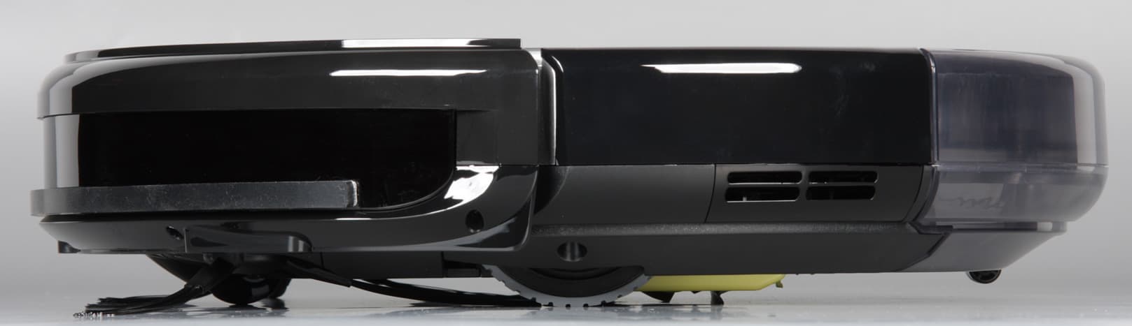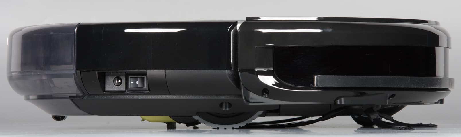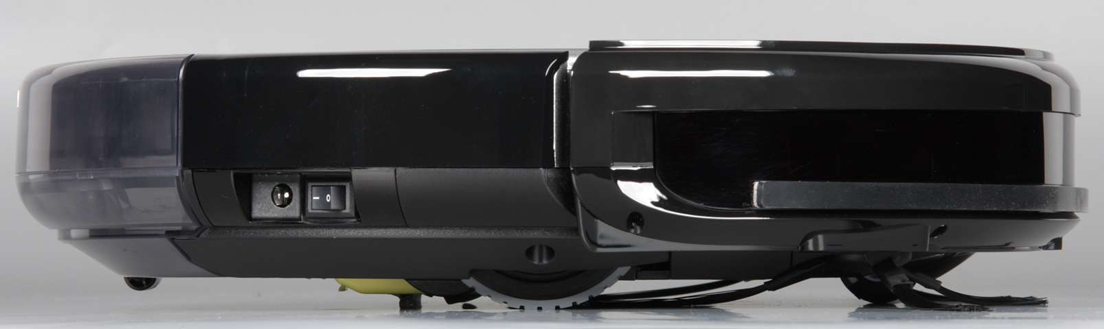 Передний ролик изготовлен из черного упругого пластика чередующегося с белым и жестким. Сделано это не просто так, а для того, чтобы робот с помощью оптического датчика, расположенного под роликом, мог определять, перемещается ли он во время уборки или нет, то есть застрял, в последнем случае робот выключается и подает сигнал бедствия.