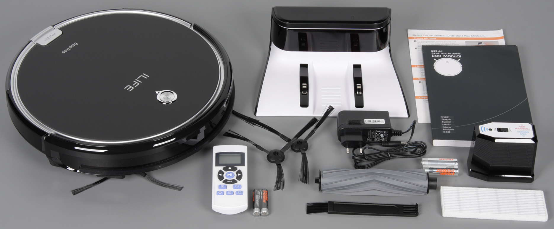 В комплект поставки входят все необходимые для работы робота аксессуары, включая элементы питания для пульта ДУ и виртуальной стены.