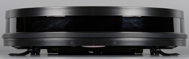 Сдвиг бампера вызывает срабатывание механических датчиков препятствий. Расстояние от пола до нижней точки бампера равно 15 мм, значит, потенциально на ступеньку такой высоты робот сможет заехать. Бампер оснащен также датчиками, определяющими нажатие сверху. Видимо, это позволяет роботу вовремя определять, что он забрался под что-то низкое, чтобы сдать назад и не застрять. Для защиты мебели спереди на бампер в нижней его части наклеена полоса из резины средней жесткости. Выше на бампере за окошком из тонированного пластика находятся ИК-датчики обнаружения препятствий, базовой станции и, возможно, приемник команд с пульта ДУ. Какие-то датчики, по всей видимости, также находятся за тонированными вставками на корпусе за бампером ближе к задней части пылесоса.