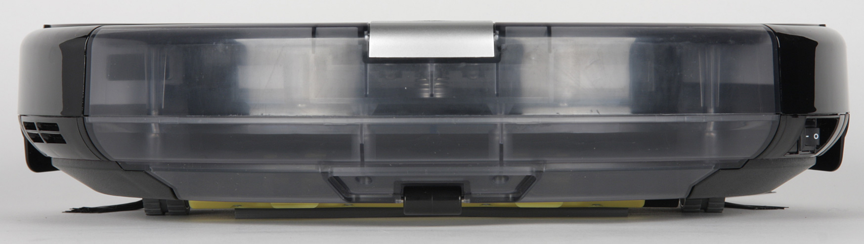 Сдвиг бампера вызывает срабатывание механических датчиков препятствий. Расстояние от пола до нижней точки бампера равно 16 мм, значит, на ступеньку такой высоты робот потенциально может заехать. Для защиты мебели спереди на бампер в нижней его части наклеена полоса из резины средней жесткости. Выше на бампере за окошком из тонированного пластика находятся ИК-датчики обнаружения препятствий, базовой станции и, возможно, приемник команд с пульта ДУ.
