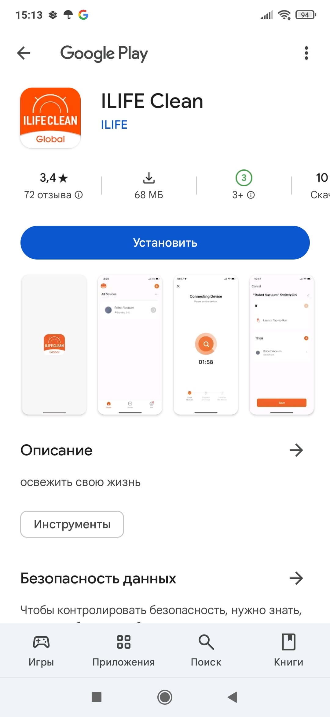 Для удаленного управления со смартфона производитель предлагает приложение iLife Clean. Мы с ним уже сталкивались, поэтому никаких сюрпризов не ожидаем. Рейтинг у приложения не слишком высокий — всего 3,4 звезды.