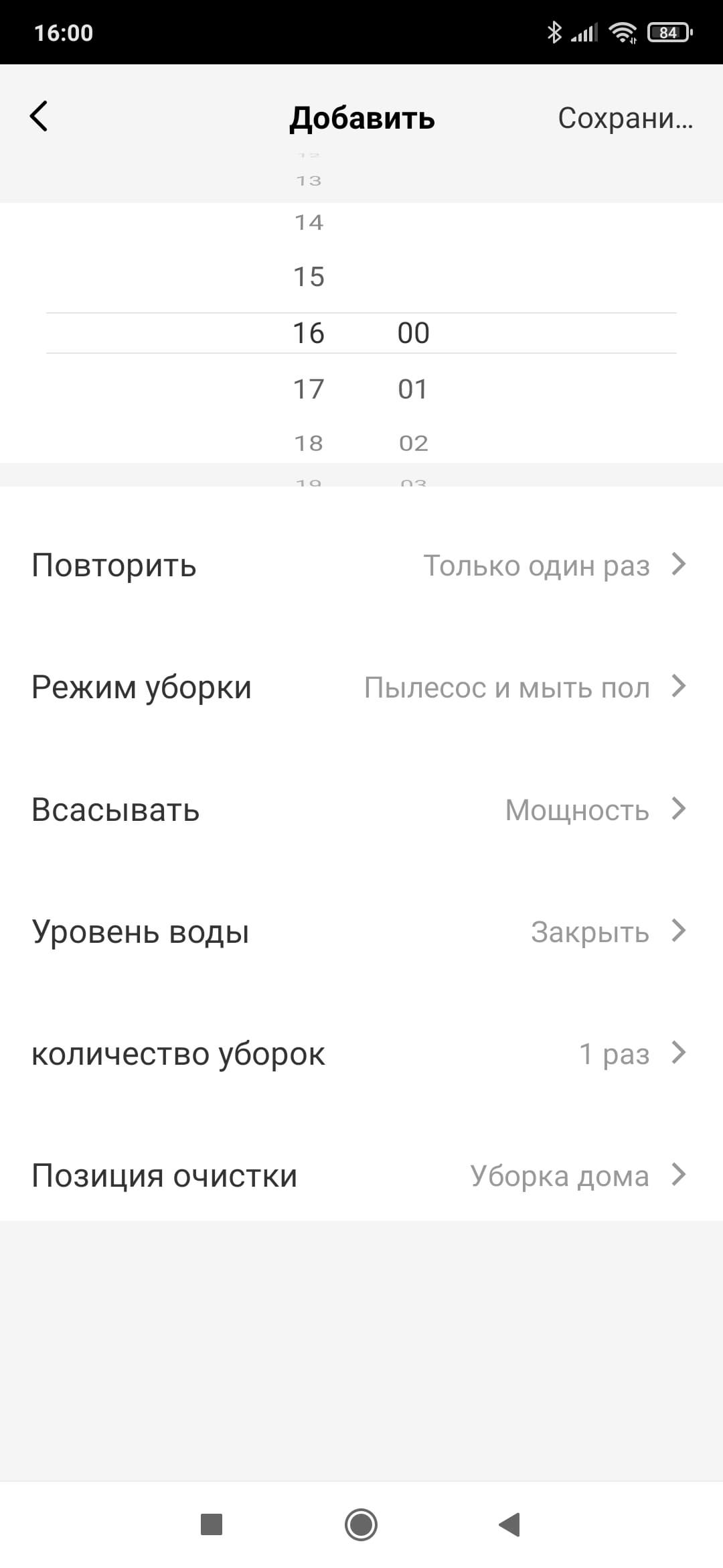Планировщик уборок по расписанию называется «Таймер». Приложение позволяет настроить несколько запусков в заданное время нужного дня недели, указав для каждой задачи мощность всасывания и количество проходов по помещению. При желании можно выбрать для уборки одну или несколько выбранных комнат.