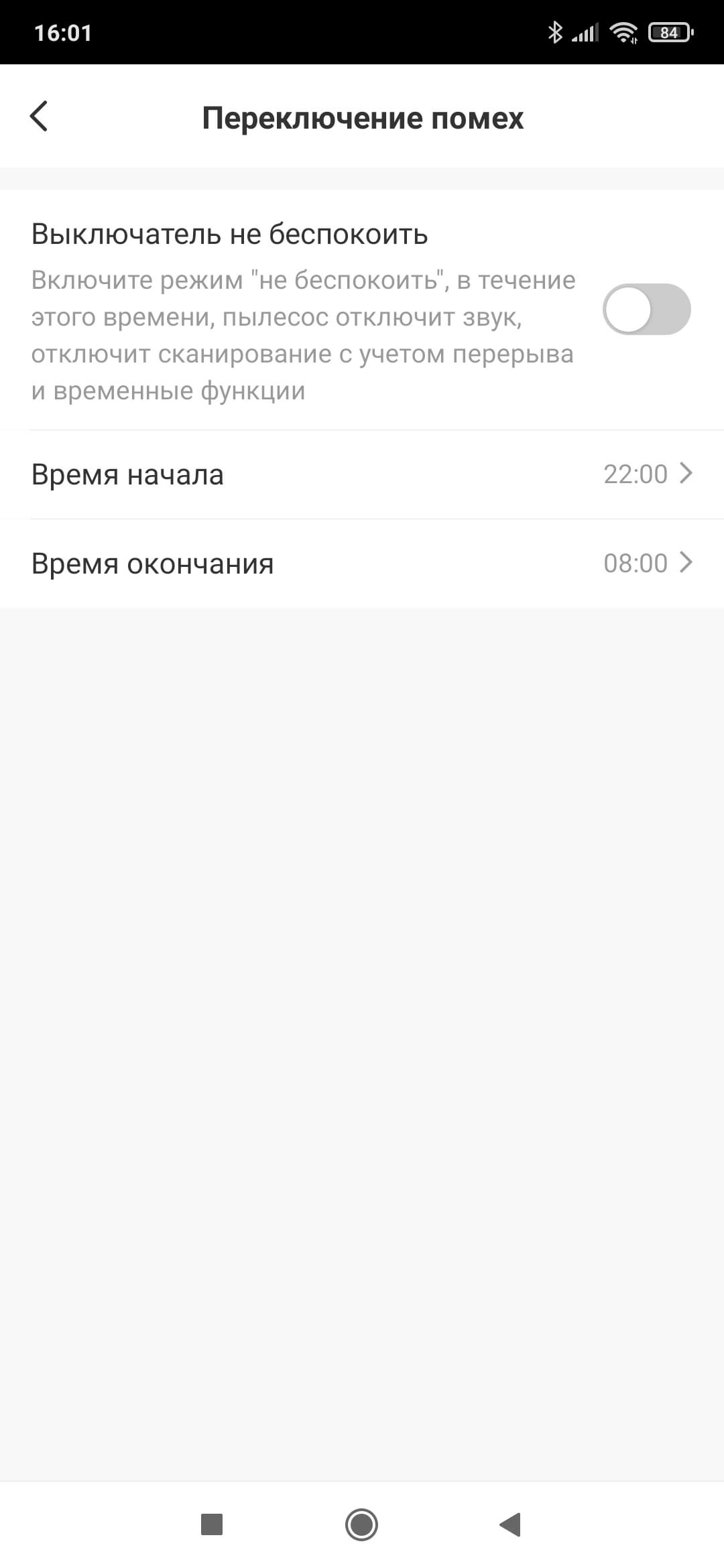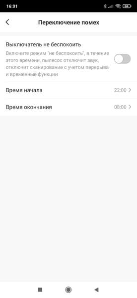Пункты меню не всегда удачно переведены на русский язык. Так, например, раздел «Переключение помех» по факту является режимом «Не беспокоить». Тут можно установить время, когда пылесос не будет возобновлять прерванную уборку и присылать уведомления.