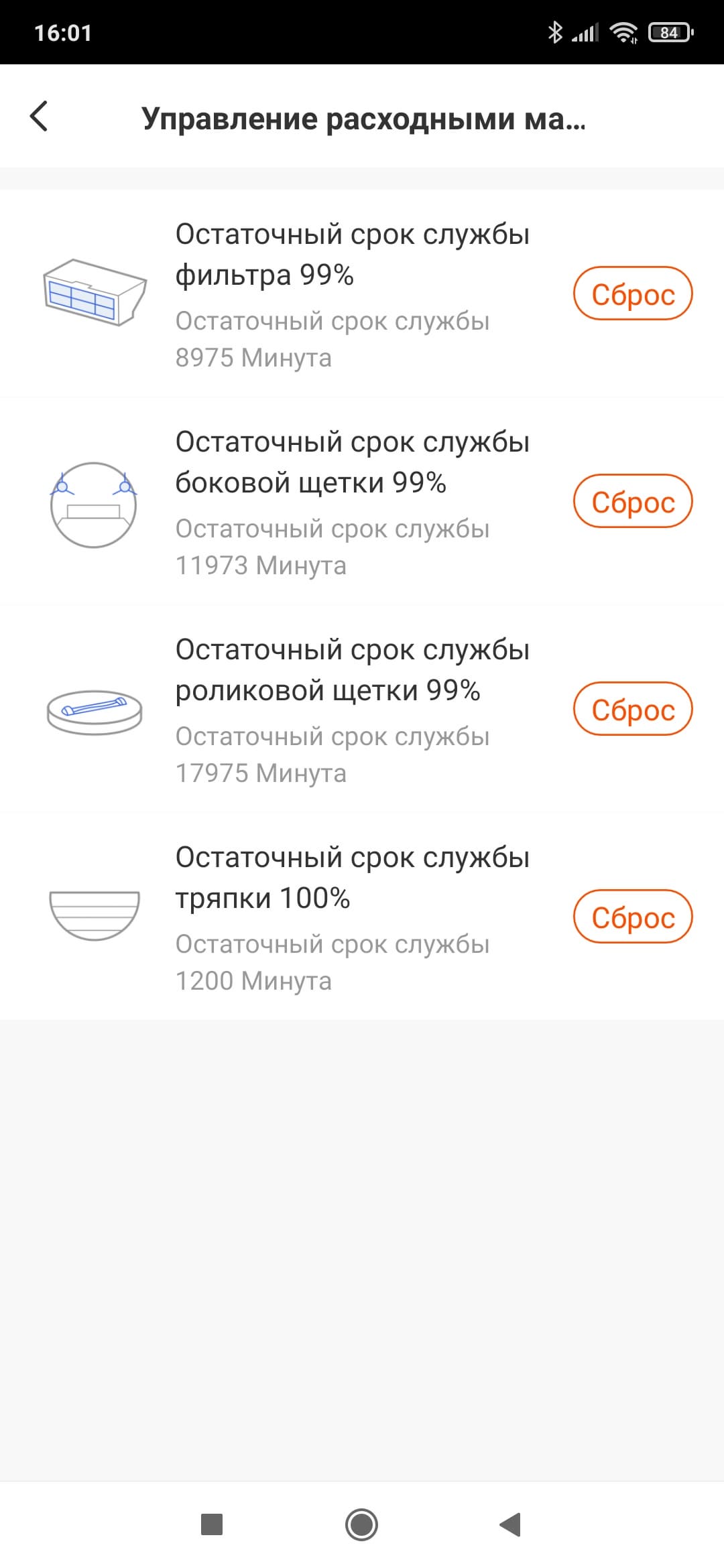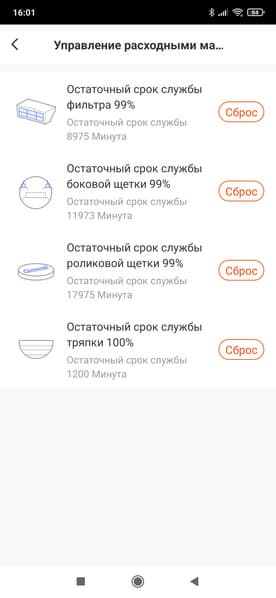 Пункт «Управление расходными материалами» предлагает узнать о ресурсе HEPA-фильтра и щеток — боковых и центральной. При замене расходников нужно обнулить сервисный интервал в приложении.