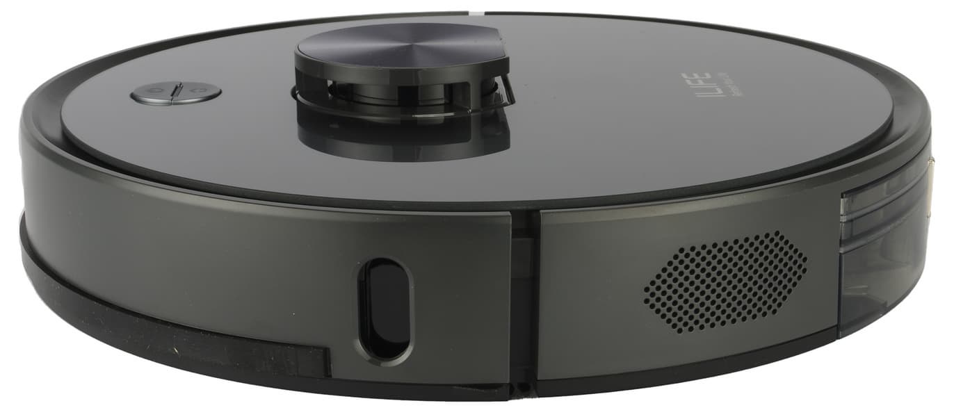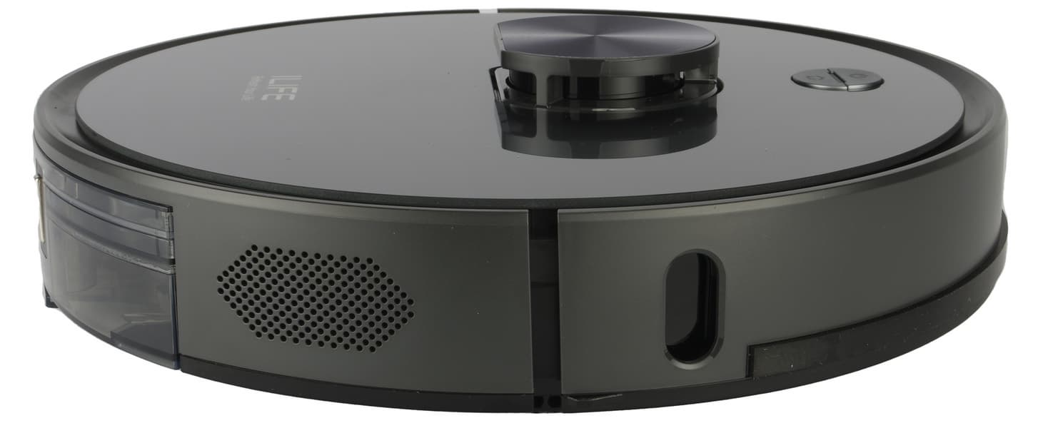 Конструкция у пылесоса традиционная, проверенная временем, и в то же время — современная: круглый корпус, одна боковая щетка и три колеса — два ведущих и опорное. Ход подвески составляет от 10 до 29 мм, что, согласно данным от производителя, позволяет роботу преодолевать препятствия высотой до 19 мм.