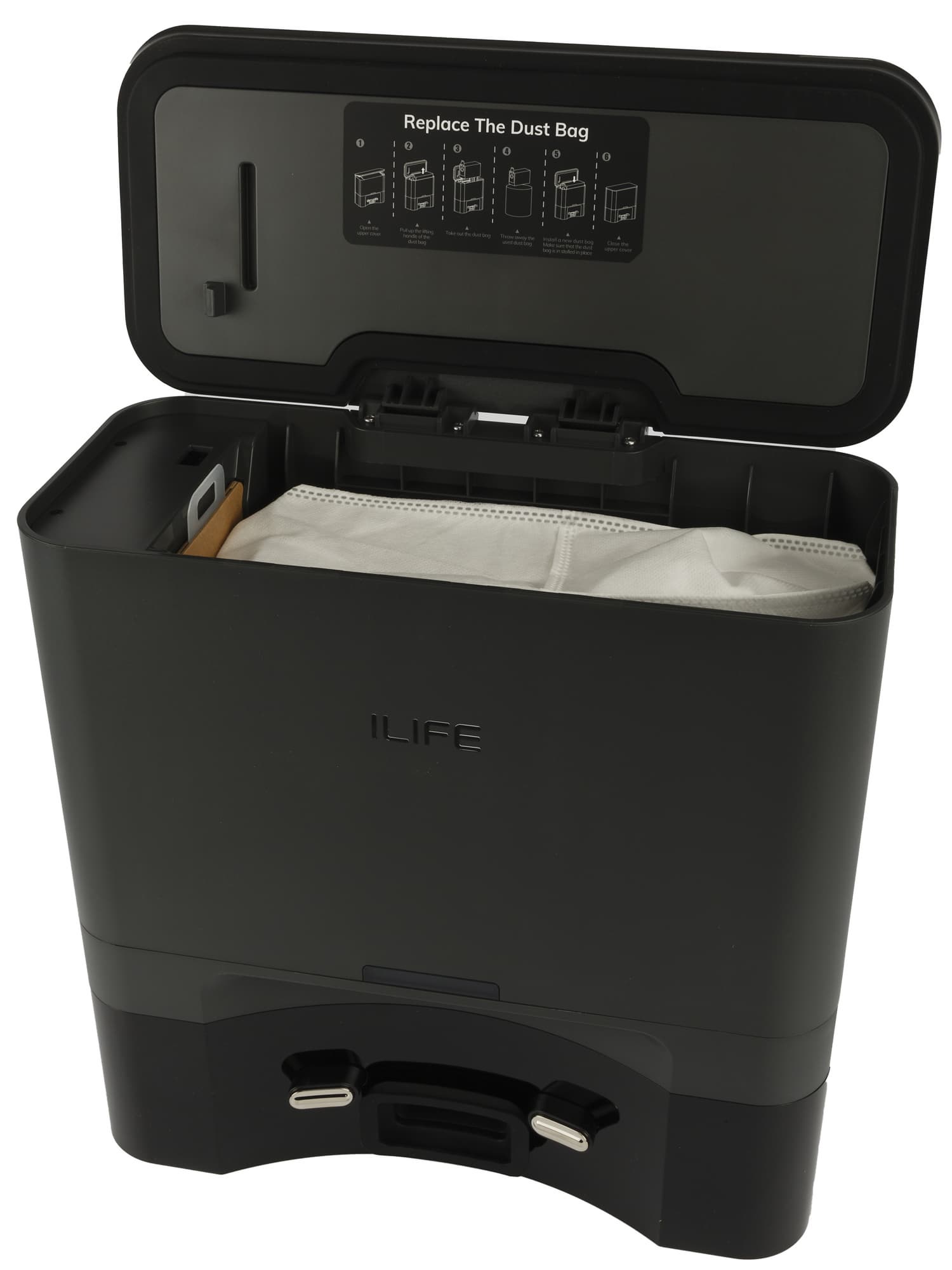 На внутреннюю сторону крышки нанесена краткая инструкция, иллюстрирующая установку мешка для мусора. Посадочное место оборудовано датчиком, который контролирует наличие контейнера: без него функция самоочистки не включится.
