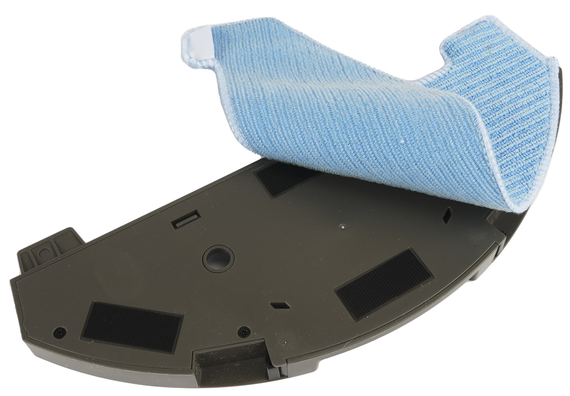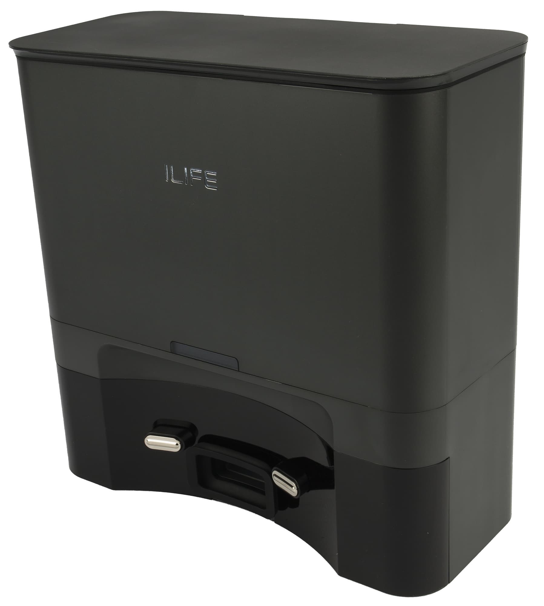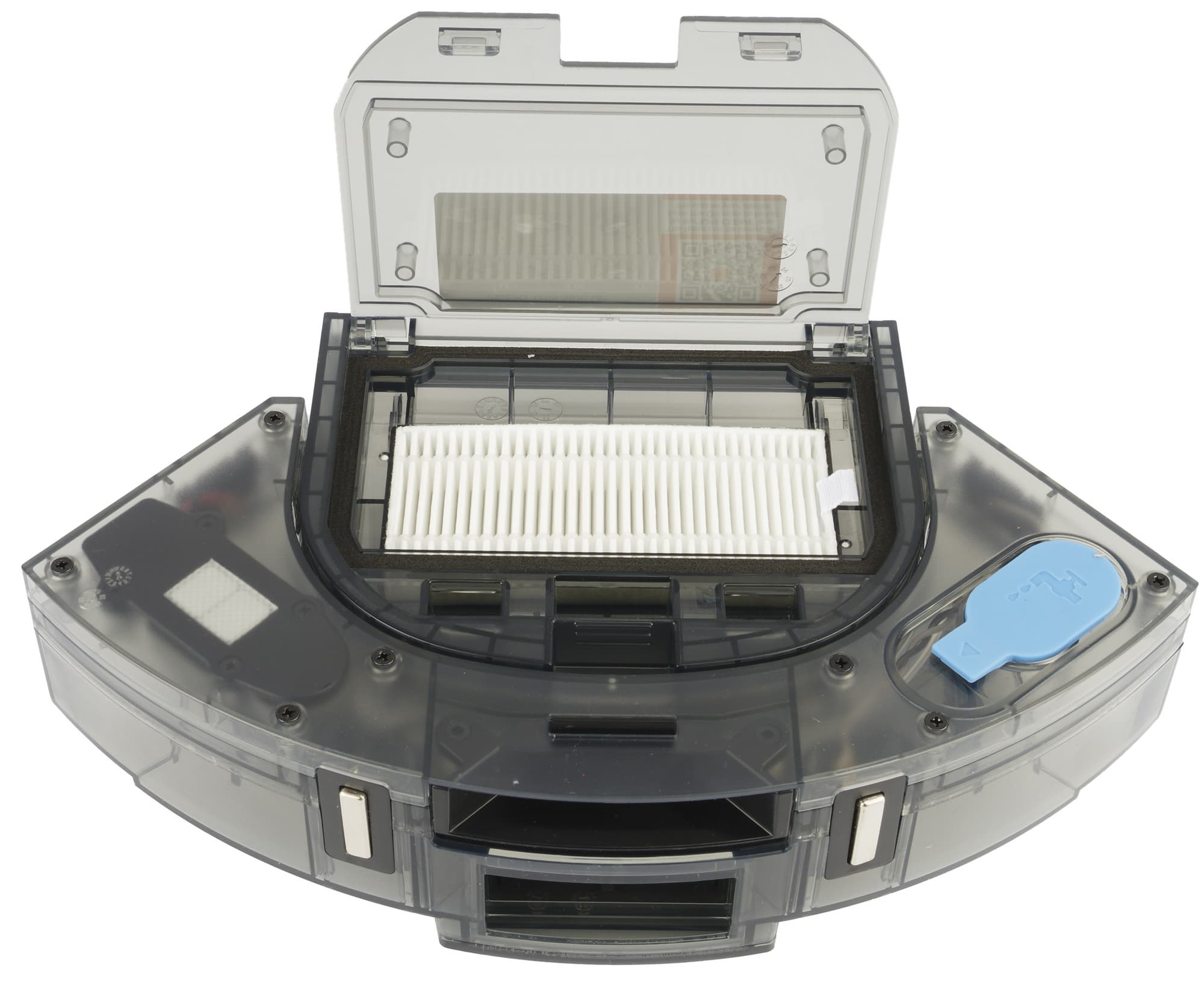 Отсек для модуля комбинированной (сухой и влажной) уборки расположен в задней части корпуса. Мусоросборник удерживается в нем удобной и надежной защелкой. В отличие от более простых роботов-пылесосов, у этой модели в контейнере есть отверстие, через которое базовая станция удаляет из контейнера мусор. Закрывается отверстие на подпружиненную шторку. Также на контейнере мы видим два контакта для зарядки.