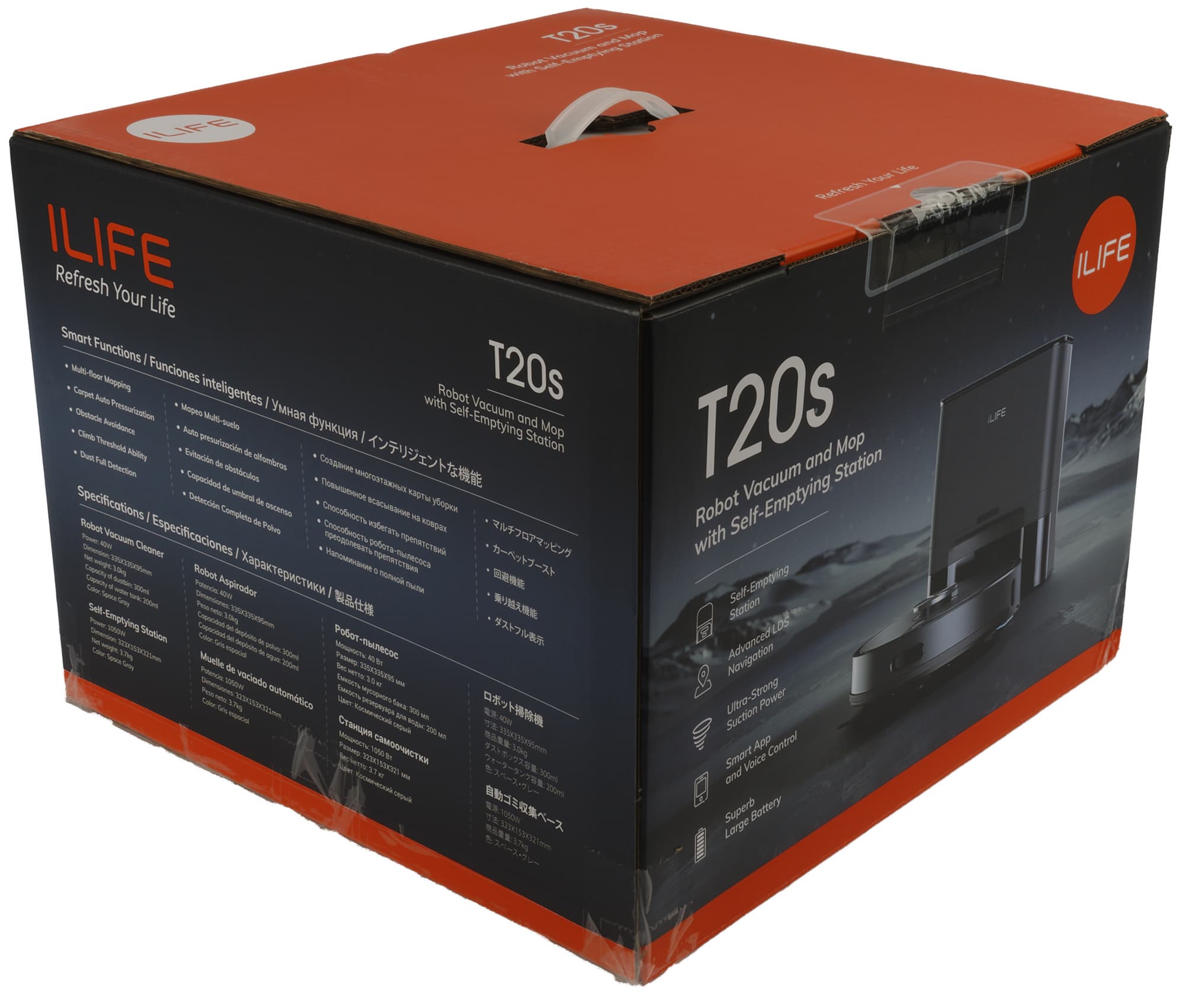 Пылесос iLife T20s поставляется в большой черно-оранжевой картонной коробке, снабженной ручкой для удобства транспортировки. На передней стороне изображено устройство в сборе. Там же перечислены основные достоинства модели.