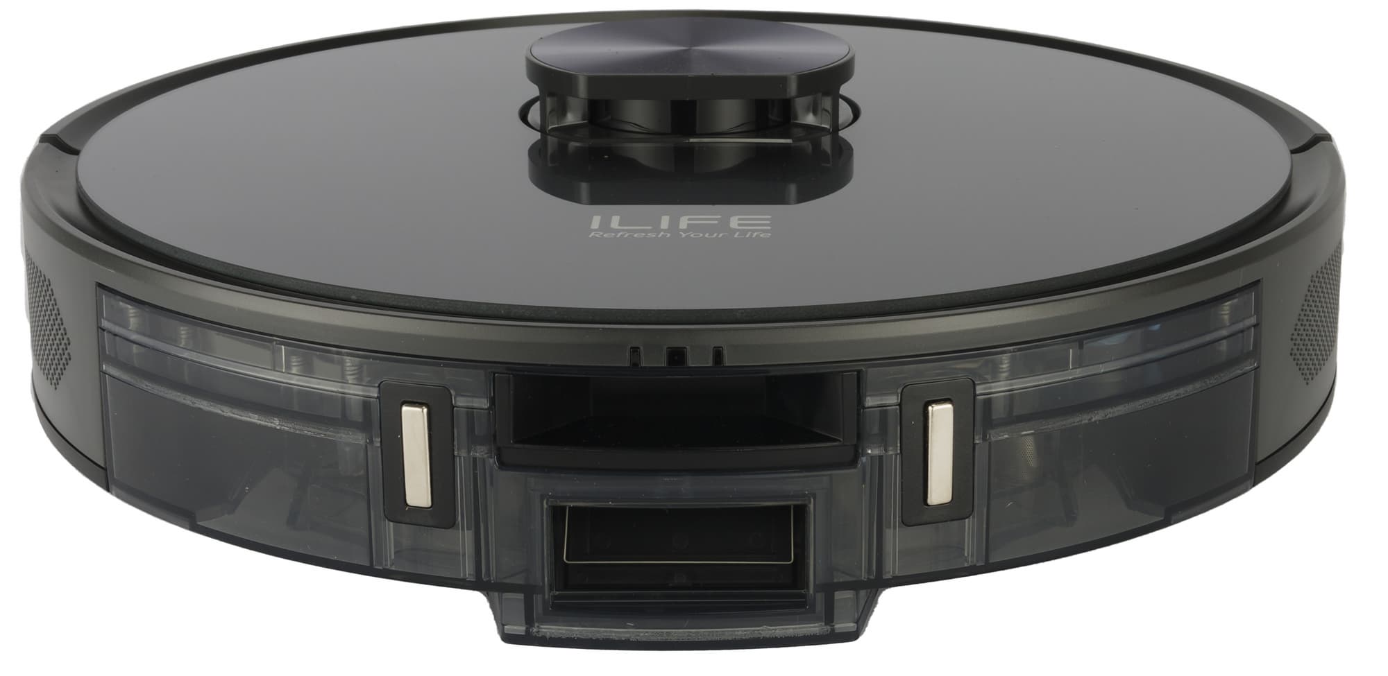 Глянцевая верхняя панель серого цвета оформлена под металл и украшена логотипом производителя. На ней выделяются башенка лазерного радара и двухкнопочная панель управления со светодиодной подсветкой.