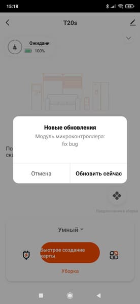 При первом запуске приложение нашло обновление прошивки для пылесоса и предложило его немедленно установить. Мы так и поступили.