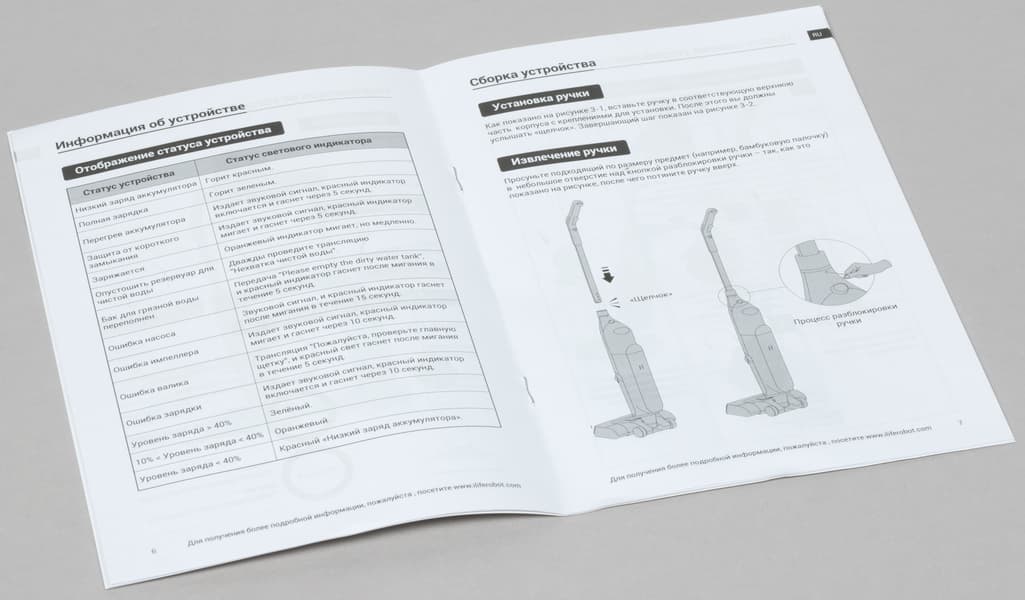 Более подробно об этих особенностях рассказано на боковых сторонах. Мы узнаем, в частности, что под уборкой «3 в 1» подразумевается всасывание, мытье и протирка. Русский текст далек от совершенства: к примеру, описание «нажмите клавишу, вода самоочищается» недостаточно точно, на наш взгляд, описывает функцию самоочистки.